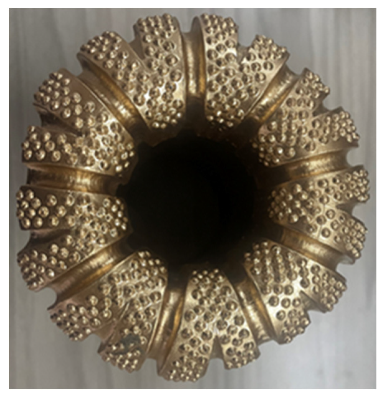 - Fang, J.; Yan, T.; Li, T. Analysis on bottom-hole wear process of double-nozzle ultra-high matrix diamond drill bit. Coal Geol. Explor. 2011, 39, 74–77. [Google Scholar]