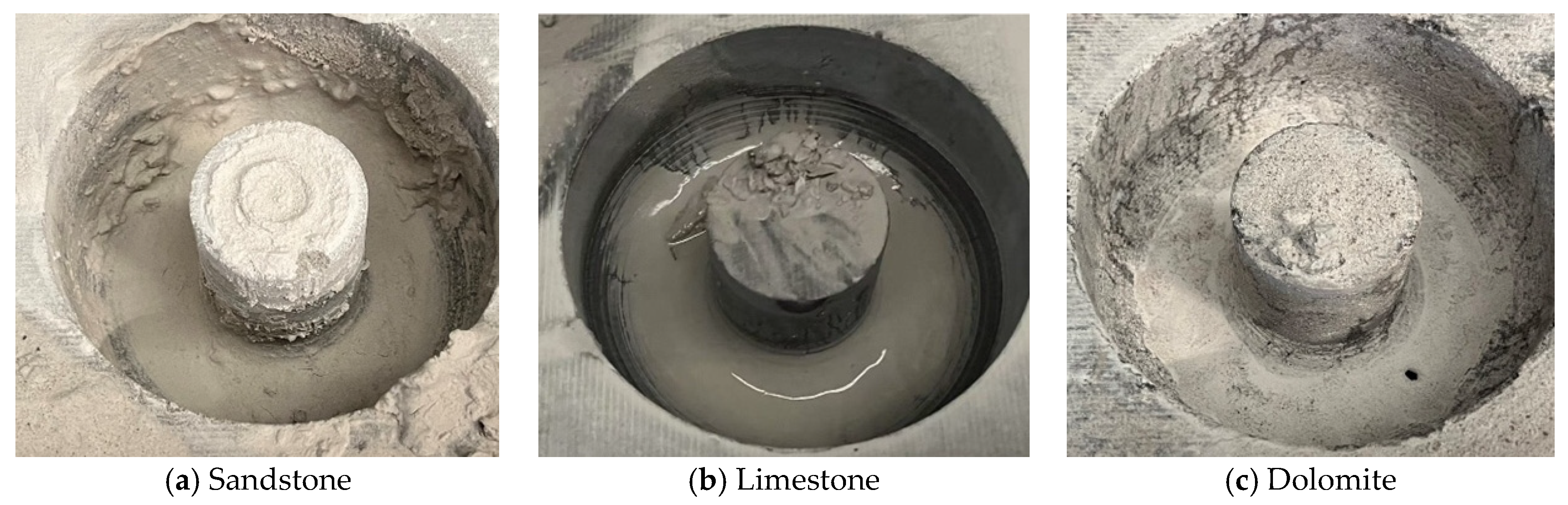 - Li, X.; Li, K.; Liang, J.; Yin, H.; Wang, Z.; Sun, J.; Zhang, Y. Analysis of core jamming causes and preventive measures in coring drilling in complex formations. Explor. Eng. 2018, 45, 12–15. [Google Scholar]