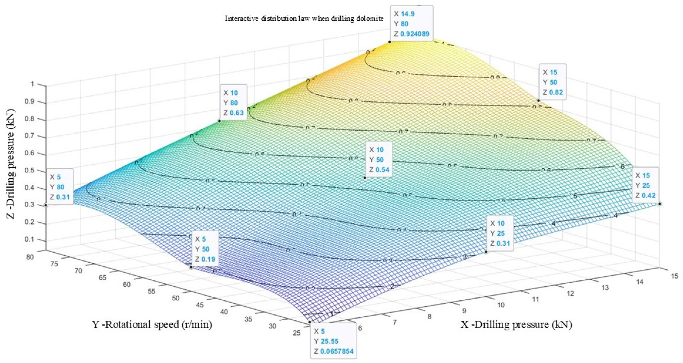 | Drilling Pressure (kN) | Rotational Speed (r/min) | MSE (J/cm3)—Sandstone | MSE (J/cm3)—Limestone | MSE (J/cm3)—Dolomite |