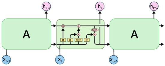The basic unit of LSTM neural network contains a cell state and three gating mechanisms: forget gate, input gate, and output gate. Each gating mechanism controls the flow of information through a sigmoid activation function, which maps the input to a value between 0 and 1, where 0 represents completely closed and 1 represents completely open. The structure diagram of its network unit is shown in Figure 2. In the figure, A on the left represents the cell state and output of the previous time step; A on the right represents the cell state and output of the current time step; Xt represents the input at the current time step.