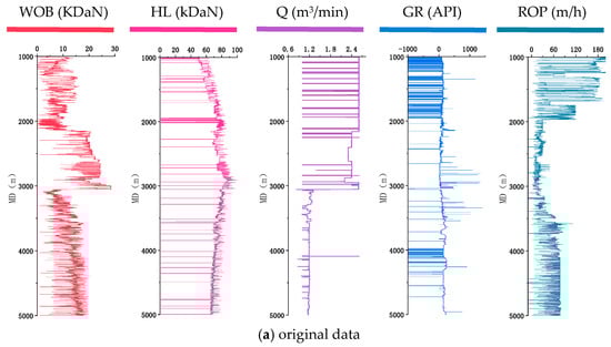 The data for this case study were sourced from the Daye 1H1 to Daye 1H3 platforms in a southwestern oil and gas field block, comprising a total of 12 wells with a vertical depth ranging from 4200 to 4600 m. Each well contains continuously acquired drilling data at a 1-m interval, resulting in a total of 77,424 samples. By analyzing mud logging and wireline logging data from the completed wells, 16 groups of potentially relevant parameters were selected: Hook Load, Rate of Penetration, Weight on Bit, Torque, Rotary Speed, Standpipe Pressure, Pump Stroke, Inlet Flow Rate, Outlet Flow Rate, Inlet Temperature, Conductivity, Equivalent Density, Total Pit Volume, d-exponent, Normalized dcn, and Sigma Index. The dataset was partitioned on an inter-well basis, with the 12 wells randomly divided into a training set (8 wells), a validation set (2 wells), and a test set (2 wells) to ensure objective model evaluation and generalization capability. Table 2 lists some training data.