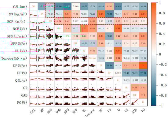 The filtered data underwent fused feature selection analysis, beginning with Pearson correlation analysis. Preliminary analysis revealed that some parameters exhibited extremely low correlation coefficients with ROP (e.g., the correlation index for HL was only 0.019), indicating negligible practical significance. A threshold was set such that parameters with an absolute correlation coefficient greater than 0.1 were considered preliminarily correlated. This threshold aimed to perform an initial, lenient screening of features, retaining variables that may have weak yet potentially meaningful engineering relevance for subsequent nonlinear analysis stages, thereby avoiding the premature elimination of valuable features. Based on the analysis results, a total of 11 parameters that demonstrated some degree of correlation were screened: Caliper (CAL), Mud Weight (MW), Weight on Bit (WOB), Rotary Speed (RPM), Torque, Differential Pressure (DP), Flow Percentage (FP), Flow Rate (Q), Natural Gamma Ray (GR), Gamma Ray While Drilling (GAB), and Gas Content (PG). The calculation results are illustrated in Figure 7.