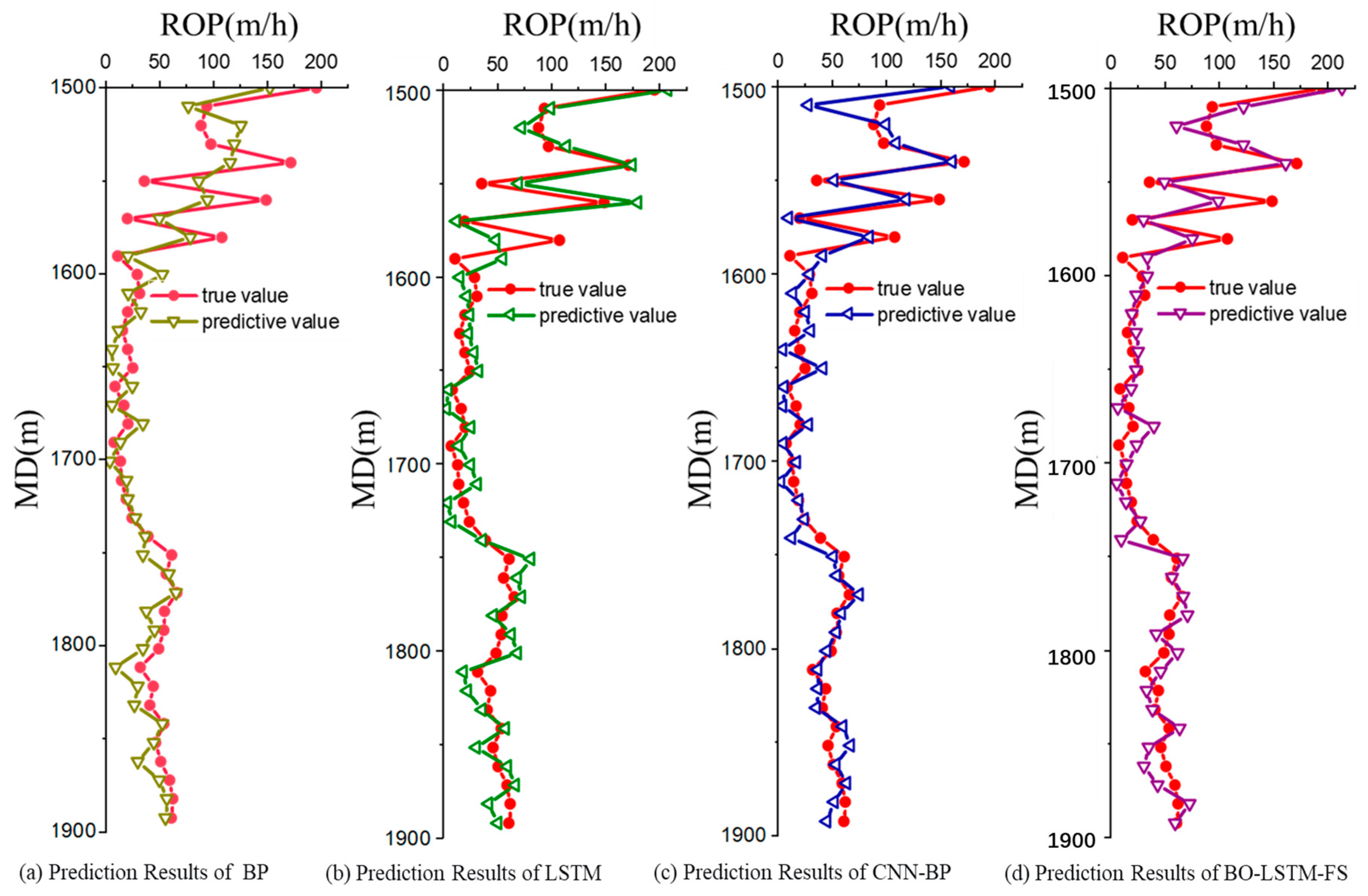 - Compared with traditional BP neural network, LSTM neural network, and CNN-LSTM model, the drilling rate prediction model established based on BO-LSTM-FS neural network shows significant improvements: the mean absolute error is reduced by 48.0%, 29.3%, and 23.5% respectively; the root mean square error is reduced by 45.5%, 38.5%, and 32.2% respectively; the mean absolute percentage error is reduced by 47.8%, 29.4%, and 22.6% respectively; and the coefficient of determination is improved by 8.6%, 4.4%, and 3.0% respectively. These results indicate that the BO-LSTM-FS model has high prediction accuracy, fast convergence speed, and strong generalization ability.
