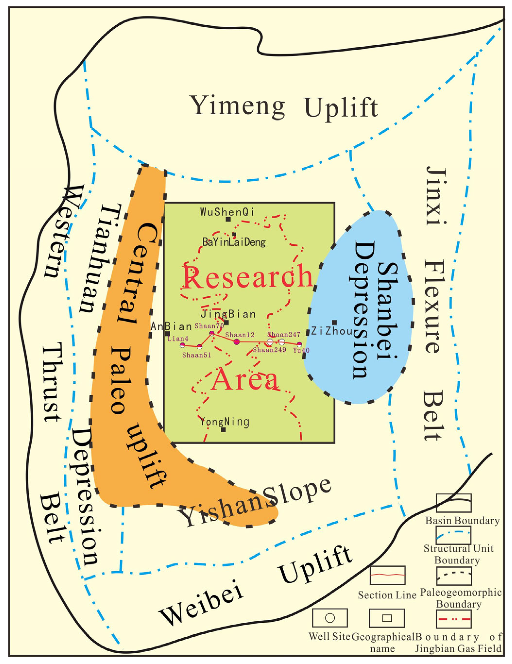 - Wu, H.Y.; Liang, T.; Cao, H.X.; Qiao, X.Y.; Wang, K.; Li, K.Y.; Yu, J.; Guo, Y.Q. Sedimentary evolution model of evaporite sequences in the upper Ordovician Majiagou Formation, Yan’an area. Acta Geol. Sin. 2020, 94, 3819–3829. [Google Scholar] [CrossRef]