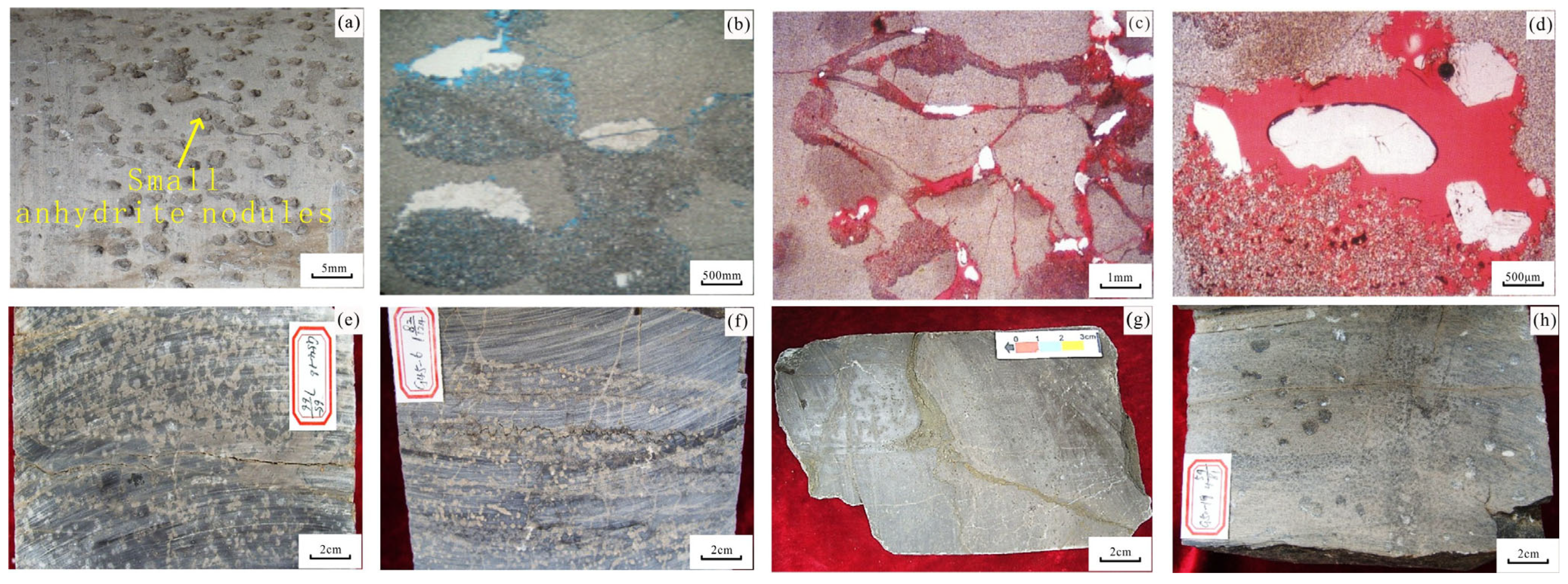 - Deng, W.; Tan, X.C.; Zhang, D.F.; Zhong, S.K.; Dong, G.D.; Xiao, M.; Lu, Z.X.; Yang, M.Y.; Xiong, Y.; Nie, W.C. Occurrence types and genesis of anhydrite in the Ma56 sub-member of the Ordovician Majiagou Formation, central and eastern Ordos Basin. J. Palaeogeogr. (Chin. Ed.) 2022, 24, 226–244. [Google Scholar]