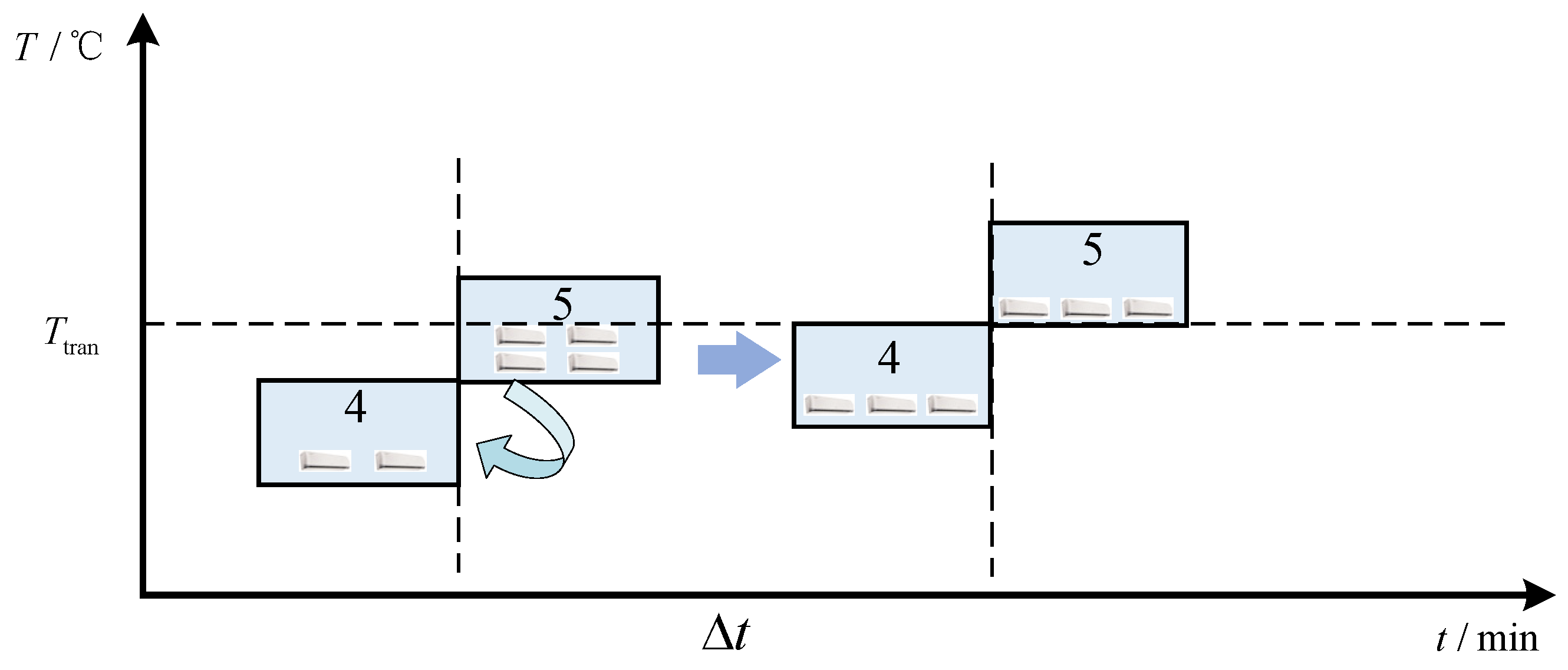 Figure 4. Before the dispatch plan is issued, if temperature state 4 is sparsely populated while temperature state 5 is densely populated, a portion of the loads in state 5 are precooled, while the loads in state 4 continue to warm up as usual. When both sets of loads reach the same temperature, the loads from state 5 are switched off and transition to the same state as those in state 4, thereby completing the pre-shifting process.