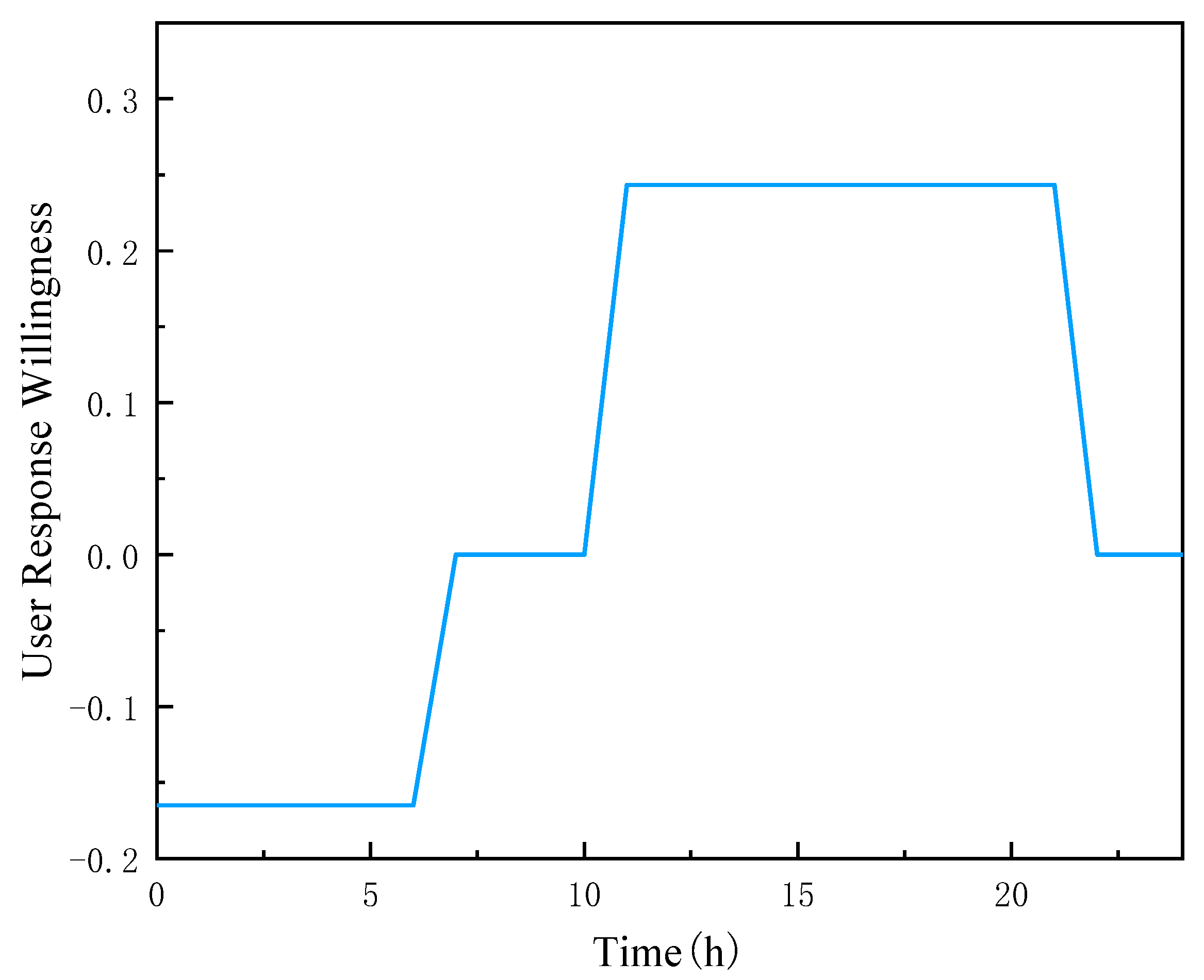 From the above equation, it is clear that the willingness factor represents the willingness of the ith user to participate in a demand-response event at time t. When is positive, it indicates that the user tends to participate more actively in demand response under a price level higher than the baseline and is willing to relax comfort constraints to some extent; when is negative, it indicates that the user tends to maintain the original comfort level under a price level lower than the baseline and is less inclined to participate. The strength of this tendency is reflected by the absolute value of , with a larger magnitude indicating a stronger propensity.