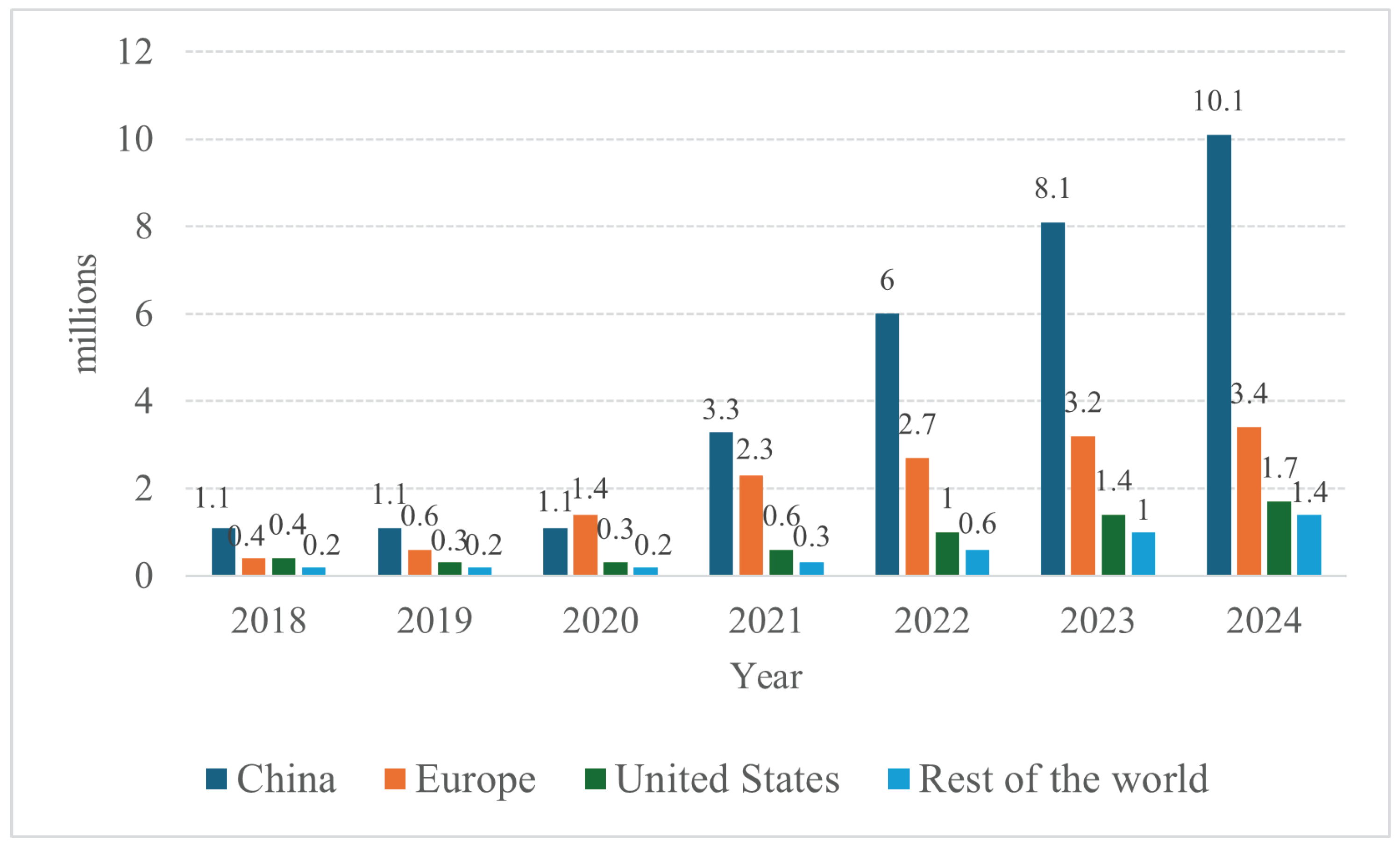 Figure 1 presents EV sales from 2018 to 2024, highlighting the strong and sustained growth of global EV adoption and underscoring its substantial future potential [