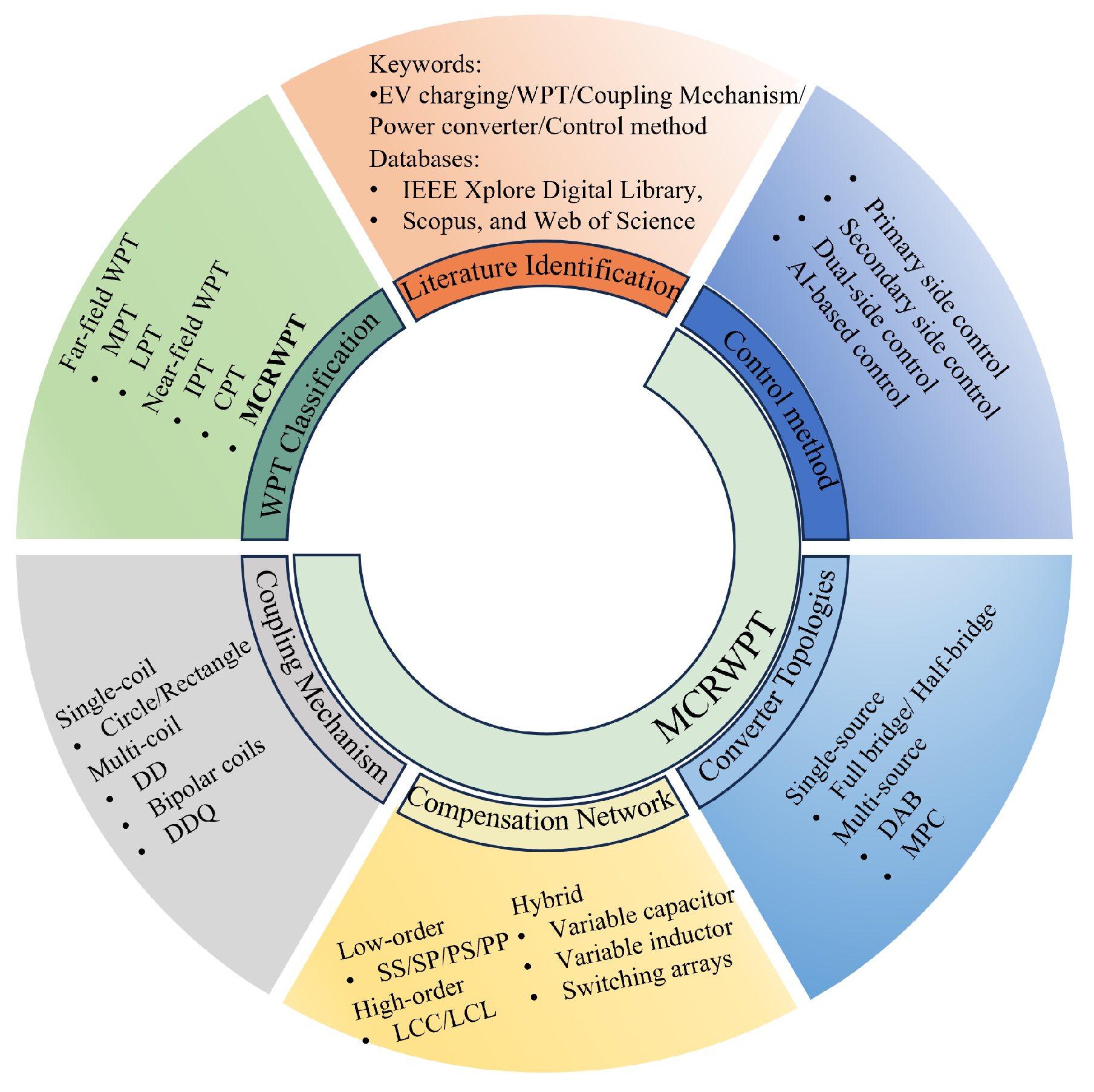 Figure 2 to clearly illustrate the literature search and review process. This framework clarifies the overall workflow, including literature identification, and classification. Specifically, the reviewed studies are systematically categorized according to key technical dimensions of MCR-WPT systems, including coupling mechanisms, resonant compensation networks, power converter architectures, and control strategies.