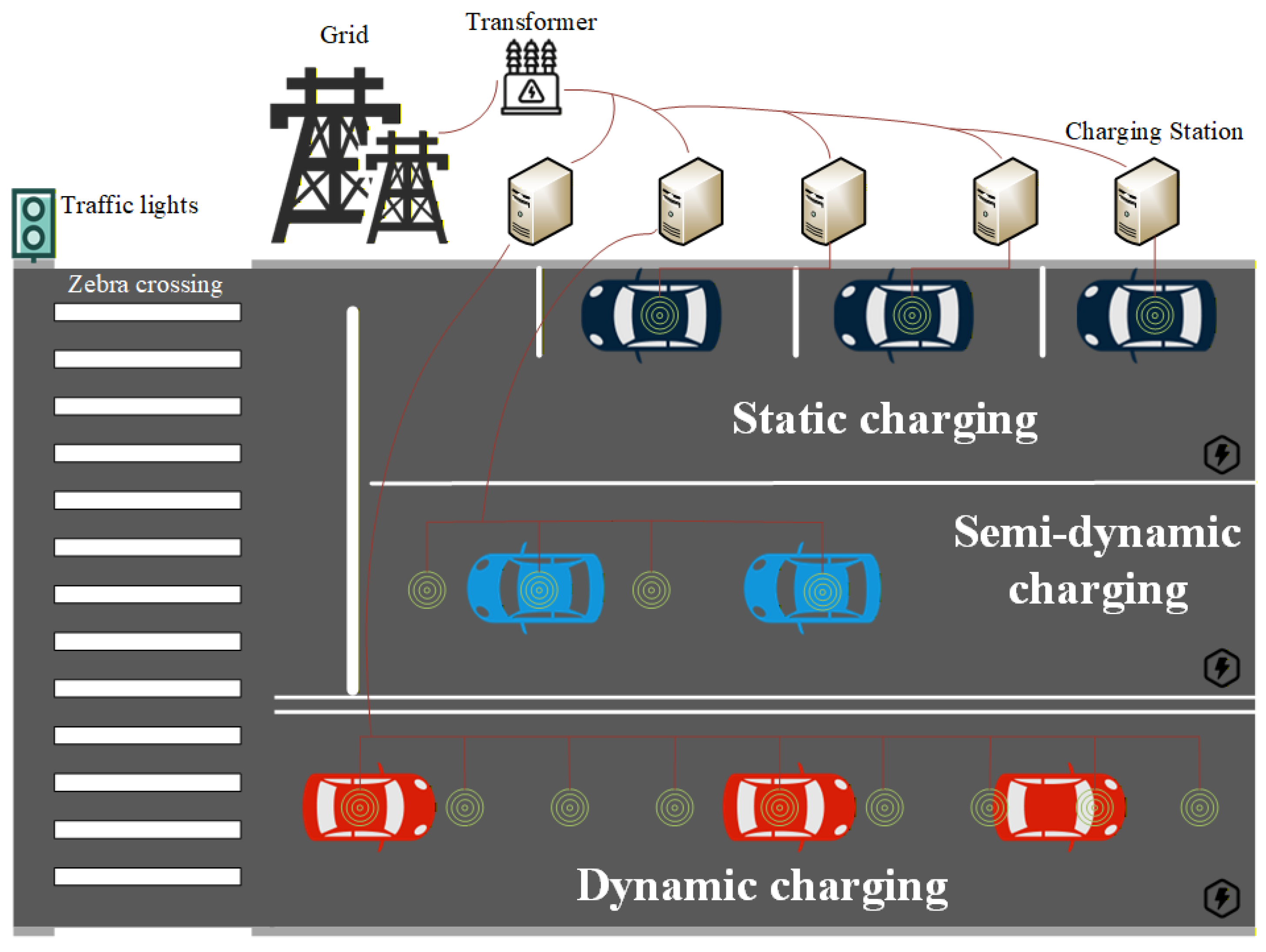 18]. Therefore, robust control algorithms and adaptive compensation network designs are essential to maintain stability and high efficiency under varying conditions. Semi-dynamic wireless charging serves as an intermediate solution between static and dynamic modes. It is typically applied in scenarios where vehicles make short stops, such as at traffic lights, bus stops, or intersections [