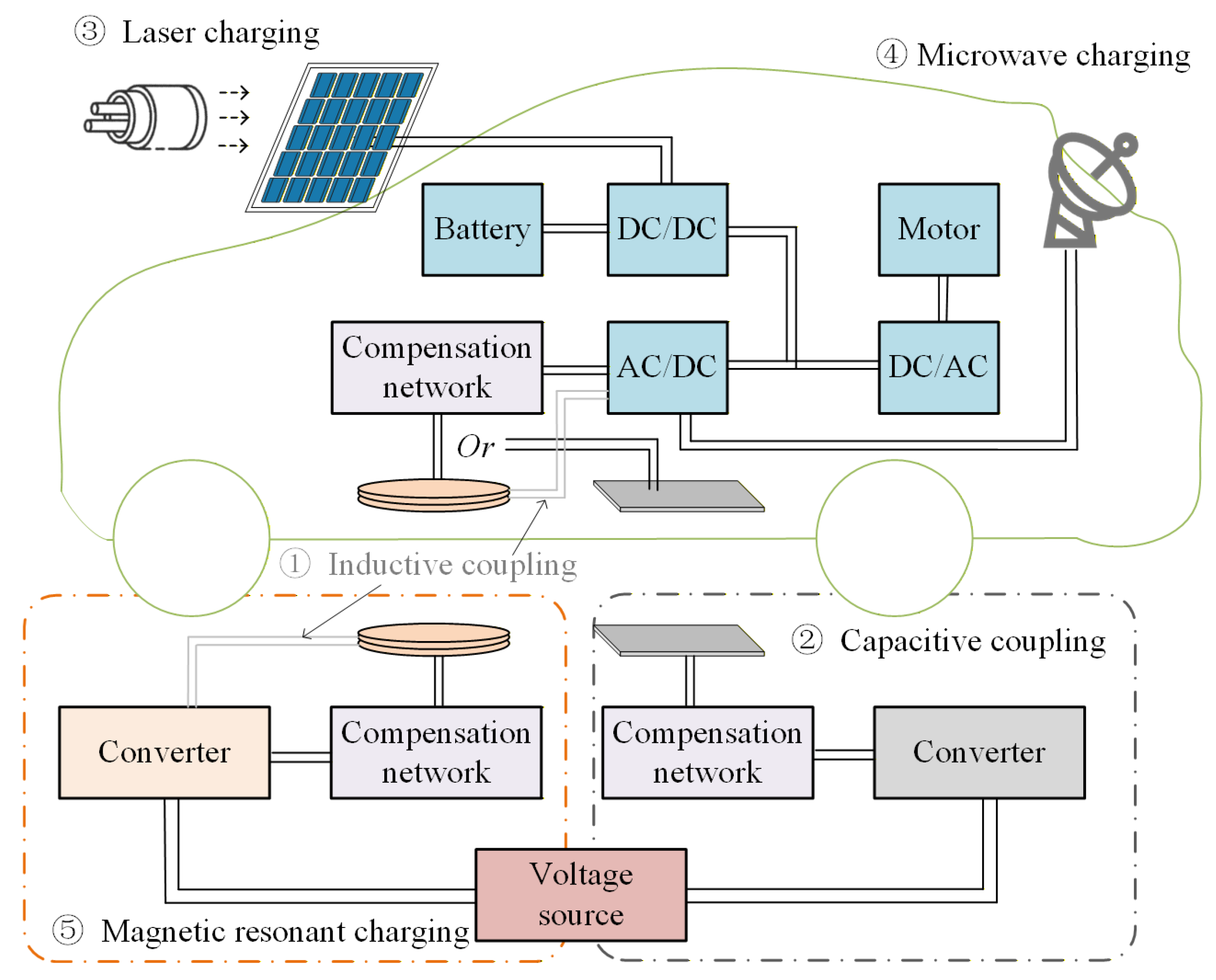 7]. Depending on the type of current used, wired charging can be categorized into AC charging and DC fast charging. AC charging requires an on-board charger (OBC) to convert AC to DC, which increases vehicle weight and limits charging speed [
