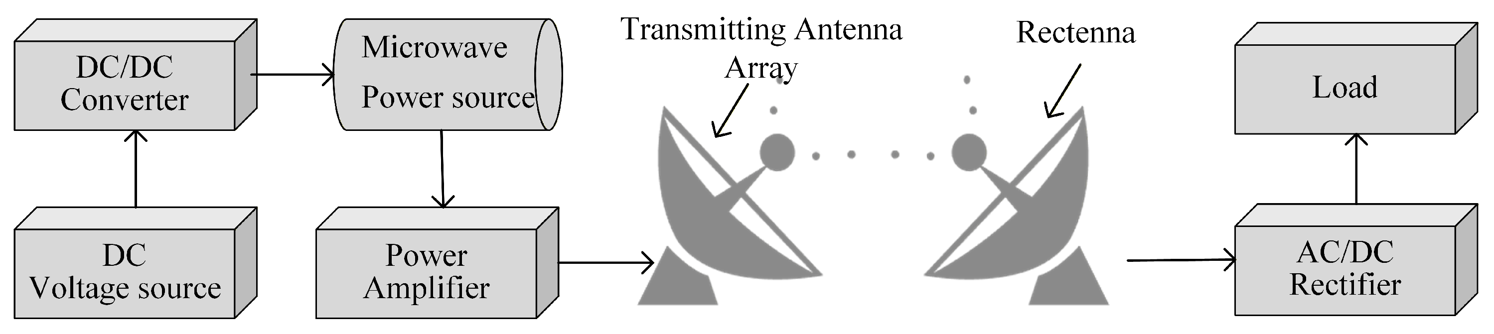 Figure 8, which mainly consists of a microwave power source, transmitting antenna, receiving antenna (rectenna), and load. During operation, the microwave power source generates high-frequency electromagnetic waves that are transmitted through space via the transmitting antenna. The receiving antenna captures the microwave energy and converts it into AC power, which is then rectified and filtered to provide stable DC power for charging the EV battery. In recent years, MPT has been considered for mid-range electric vehicle (EV) charging, where systems using 2.45 GHz magnetrons have demonstrated 10 kW transfer over 5 m at efficiencies nearing 80% [