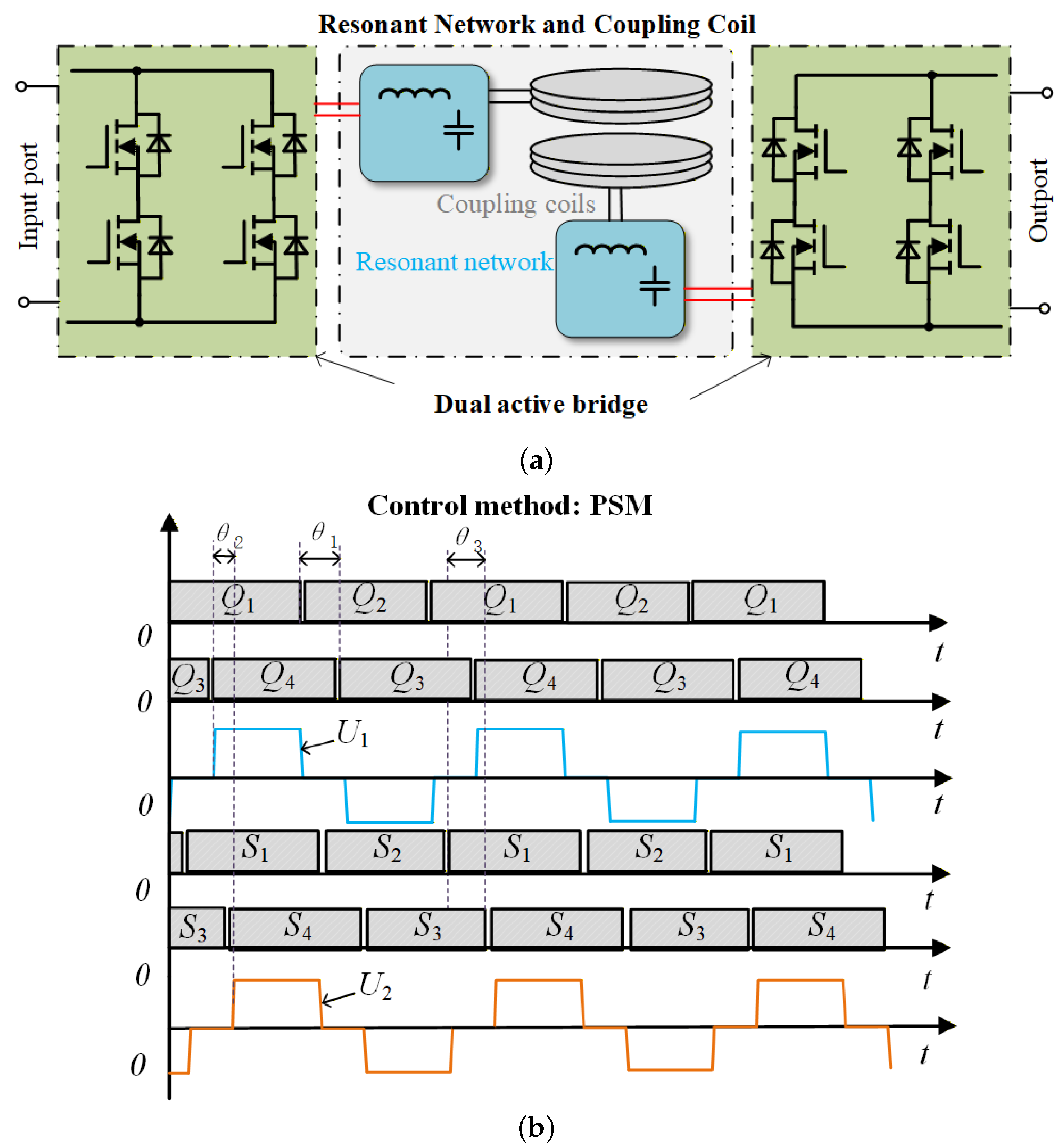 101] introduced a hybrid-modulation SPWM–based multi-frequency WPT architecture in which the inverter synthesizes different frequencies to independently supply loads with distinct resonant characteristics, achieving a power factor as high as 0.99. Compared with frequency control, phase-shift control (PSC) regulates power by adjusting the phase difference between the upper and lower bridge arms of a full bridge, without altering the switching frequency. PSC modulates the amplitude of the fundamental component of the inverter output voltage while maintaining operation at the optimal resonant point. As a result, it typically achieves wide-range power control along with zero-voltage switching (ZVS) over the full load range.