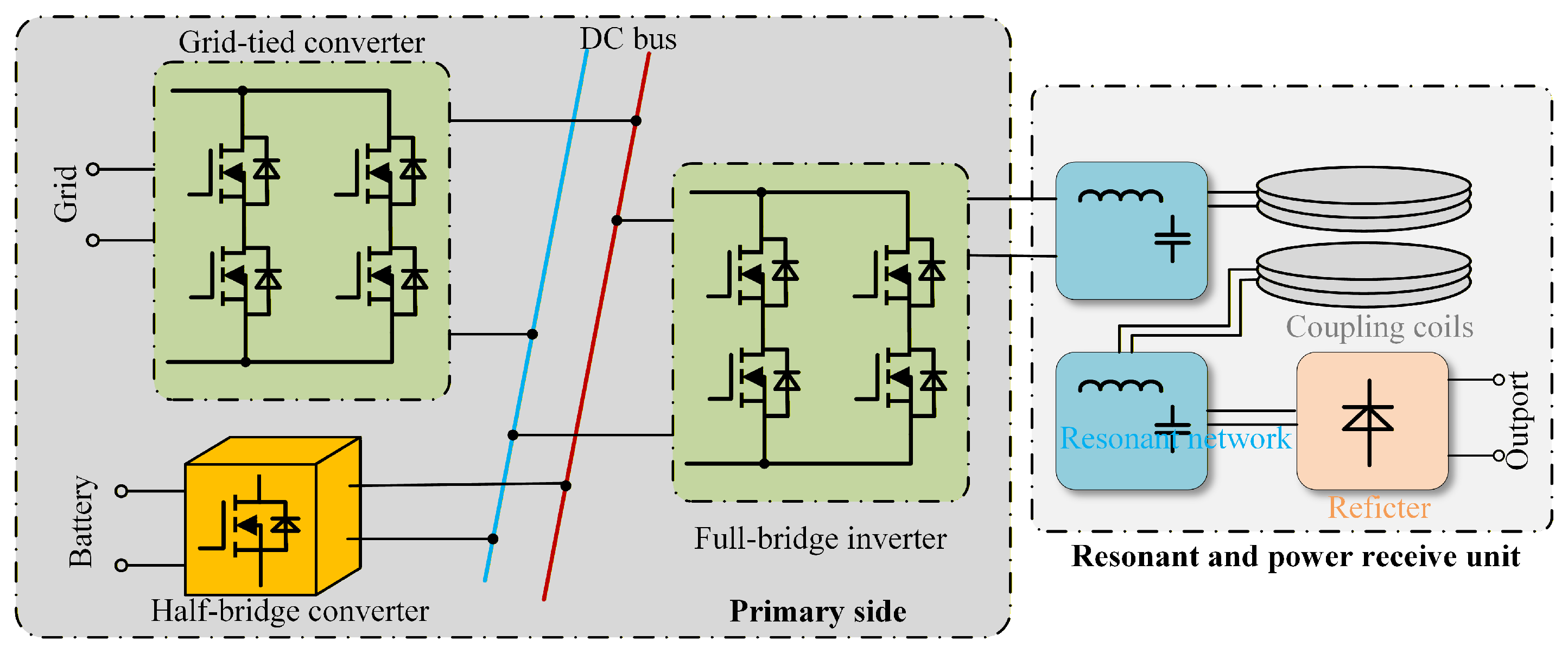In the area of power cooperative control, research primarily focuses on how to coordinate primary- and secondary-side controllers to simultaneously achieve constant-current/constant-voltage (CC/CV) charging and system-efficiency optimization. For higher-power applications, ref. [