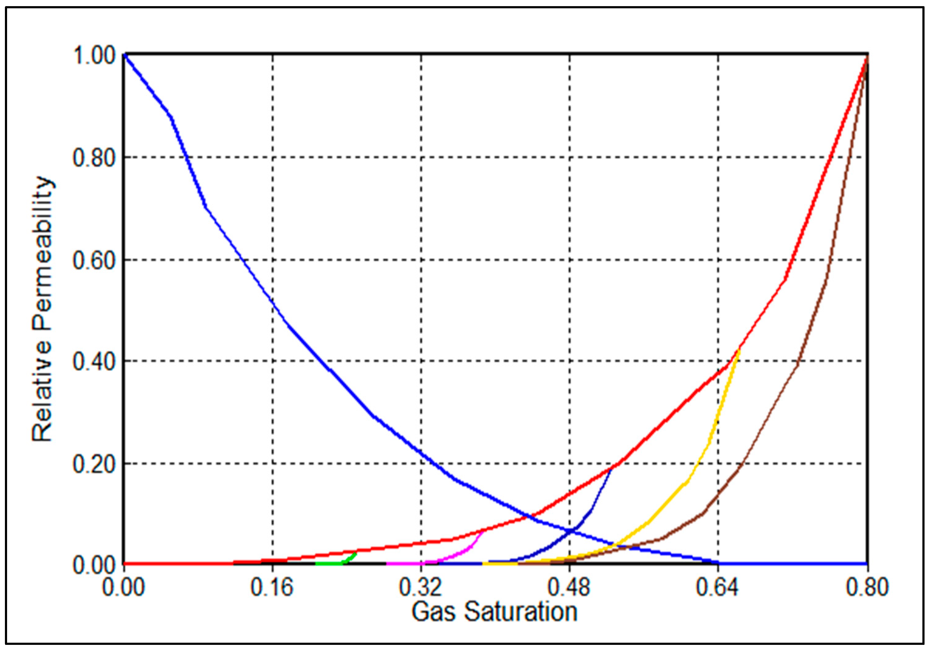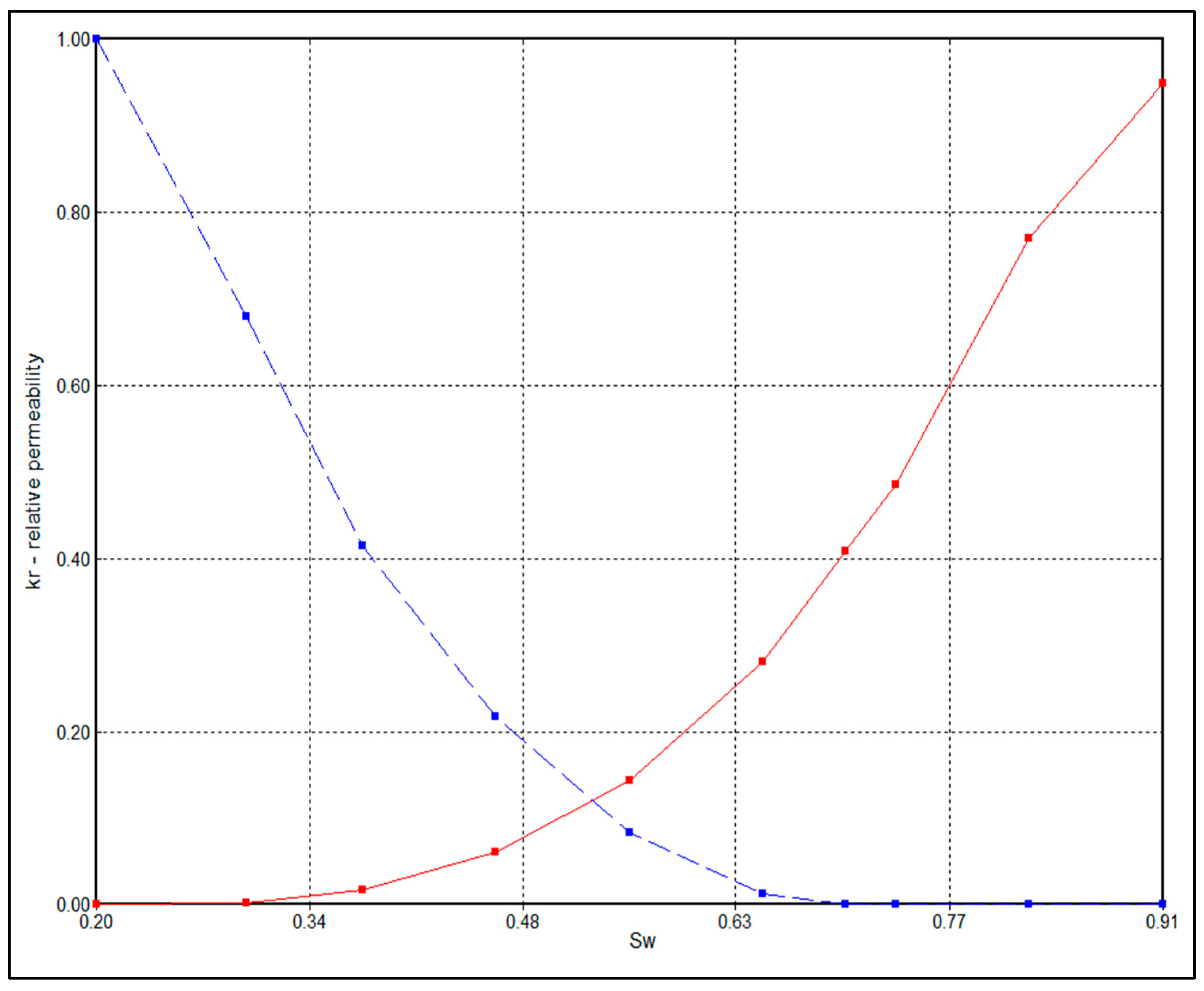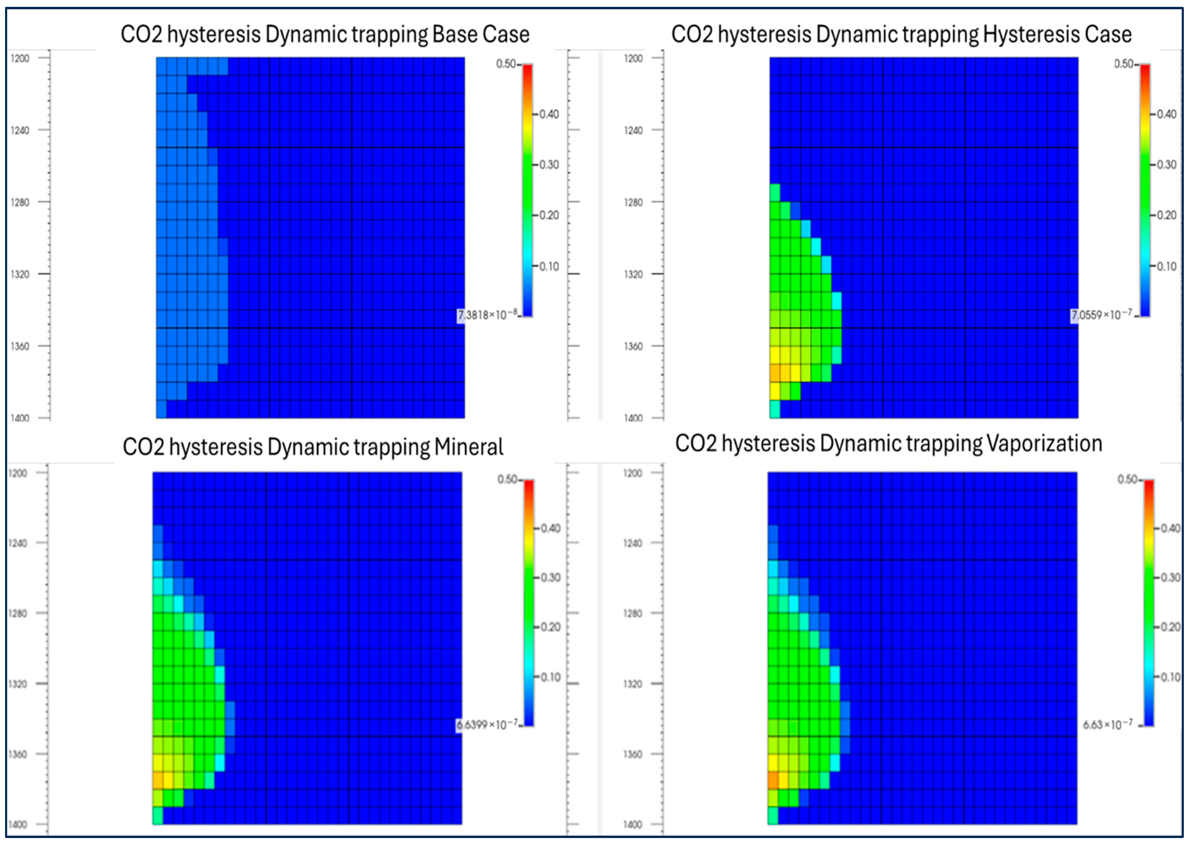 In the base case, the hysteresis is off, and consequently, most of the injected CO2 is mobile. The CO2 plume is buoyant and accumulates structurally without much permanent trapping. Consequently, the reservoir has zero Sgr, which suggests a high potential for long-range migration if not trapped by structure.