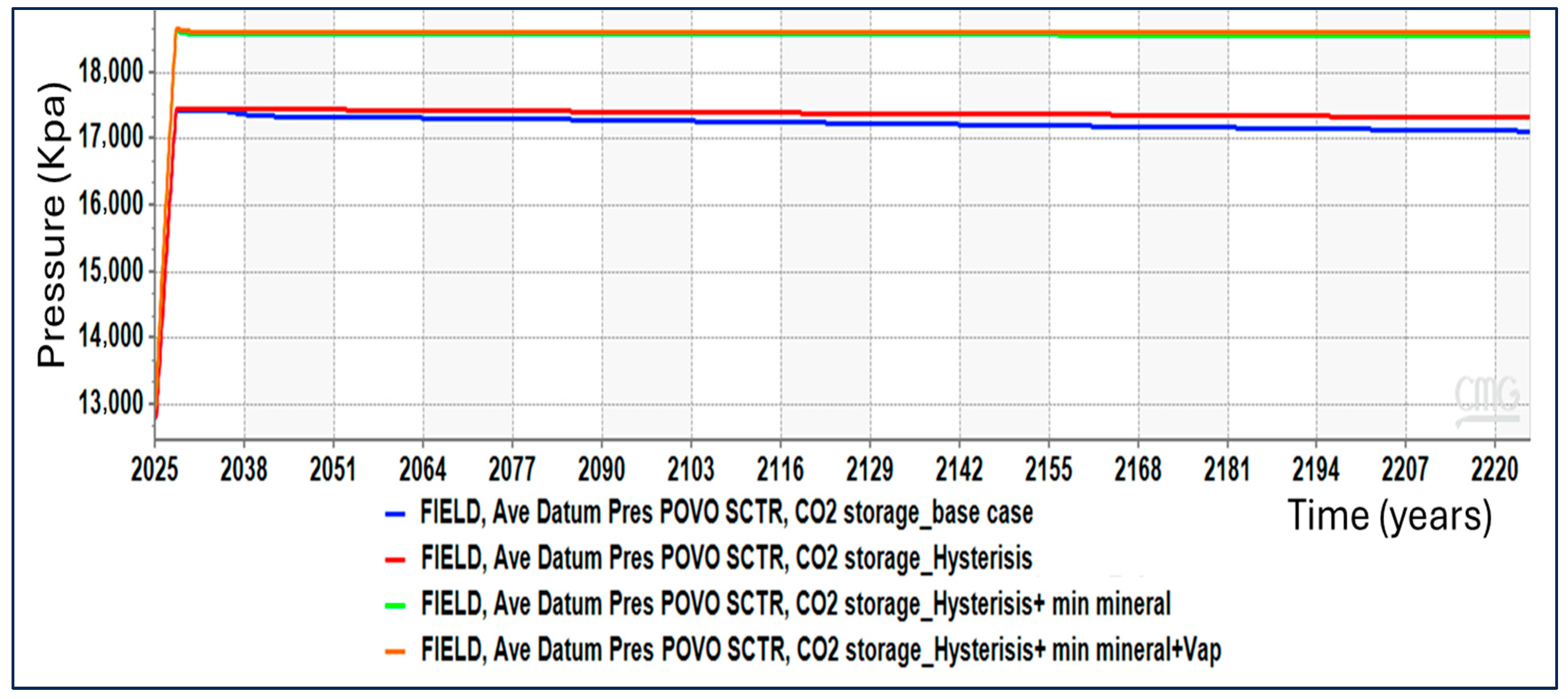 In the base case, the stabilized pressure is the lowest. This is due to the absence of other trapping mechanisms that allow more CO2 to be in the supercritical fluid phase, which is able to distribute more efficiently in the reservoir, thereby resulting in lower stabilized pressures.