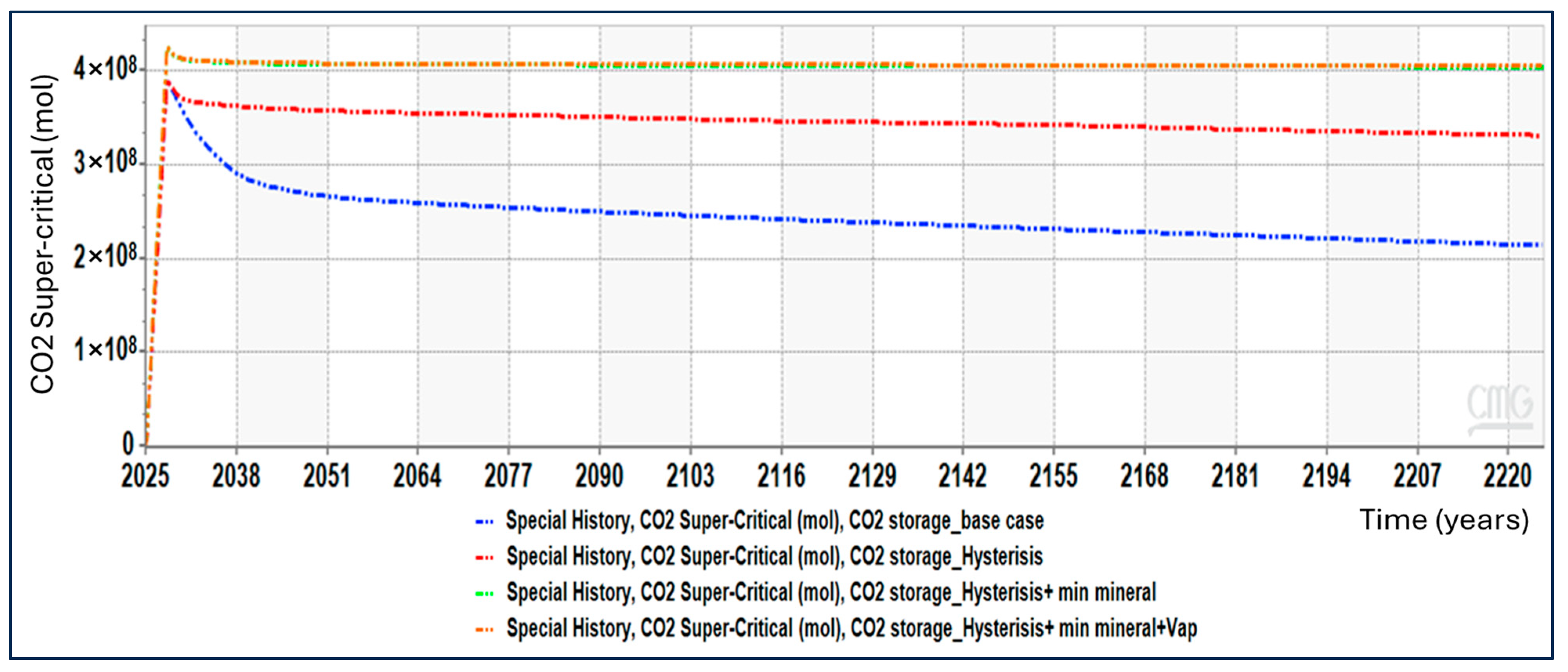 The inclusion of mineral reactions further stabilizes the system. Although mineral trapping is a slow process, it gradually consumes dissolved CO2, indirectly reducing the amount of CO2 available to remain in the free supercritical phase. As a result, the supercritical CO2 curve becomes flatter over time, indicating enhanced long-term containment.