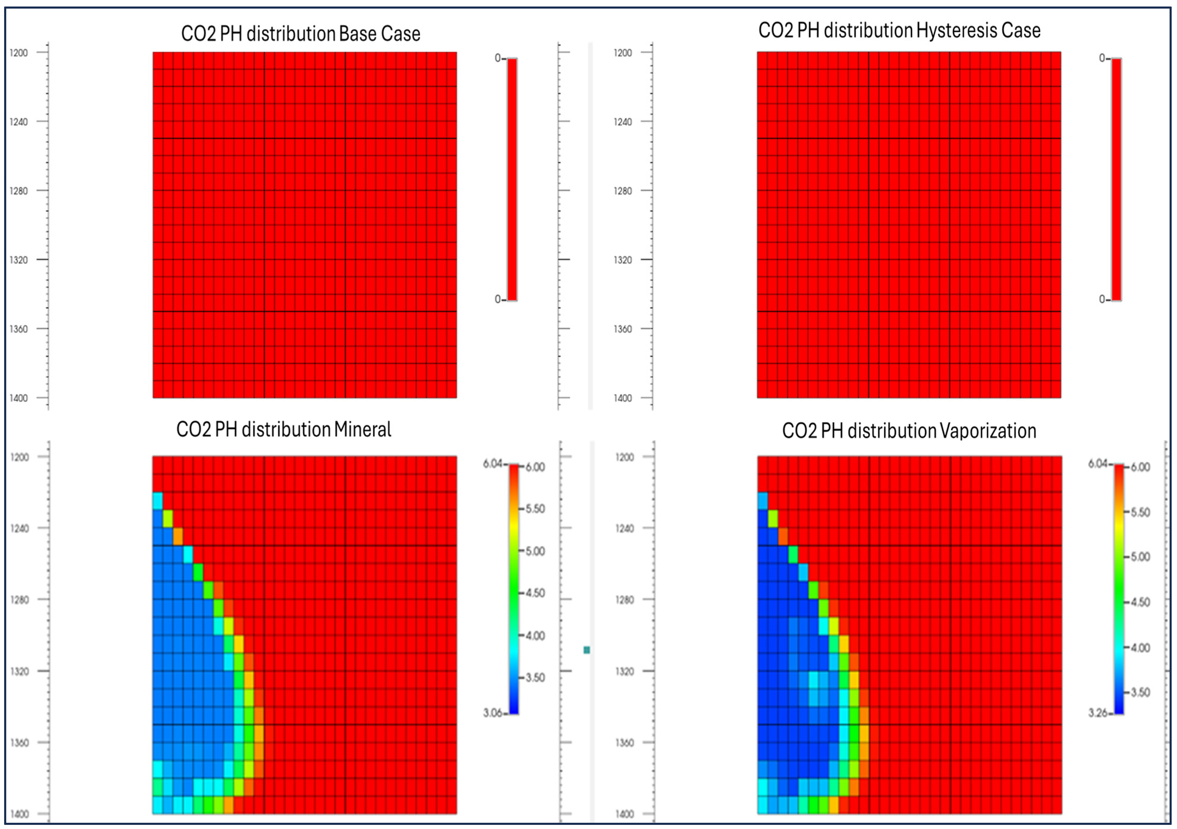 The greatest degree of geochemical influence takes place when the degree of vaporization is estimated. The highest degree of the hysteresis + mineral + vaporization effect demonstrates the largest degree of acidification. Water vaporization to form CO2 effects high salinity of the brine and decreases the saturation of the aqueous systems. The dissolution of the CO2 accelerates mineral reactions. This contributes to a larger chemically altered region together with a faster transition to a steady-state mineral form. The pH effect demonstrates the degree to which the vaporization influence accelerates the immobilization of the chemical processes. Taken together, these findings demonstrate that pH sensitivity serves as a highly informative factor for the efficiency of geochemical trapping in CO2 storage. In the case of scenarios without mineral reactions, there is very little variation in pH values, demonstrating the ineffectiveness of physical trapping in converting CO2 into a less harmful form over a long period of time. When chemical processes become operational, the acidity in the reservoir develops in a manner proportional to dissolution rates and the range of mineralization. The expanded region of acidity in the scenario of vaporization enhancement further substantiates the optimistic effects of combining different mechanisms of trapping in terms of both magnitude and rapidity for permanently storing CO2.