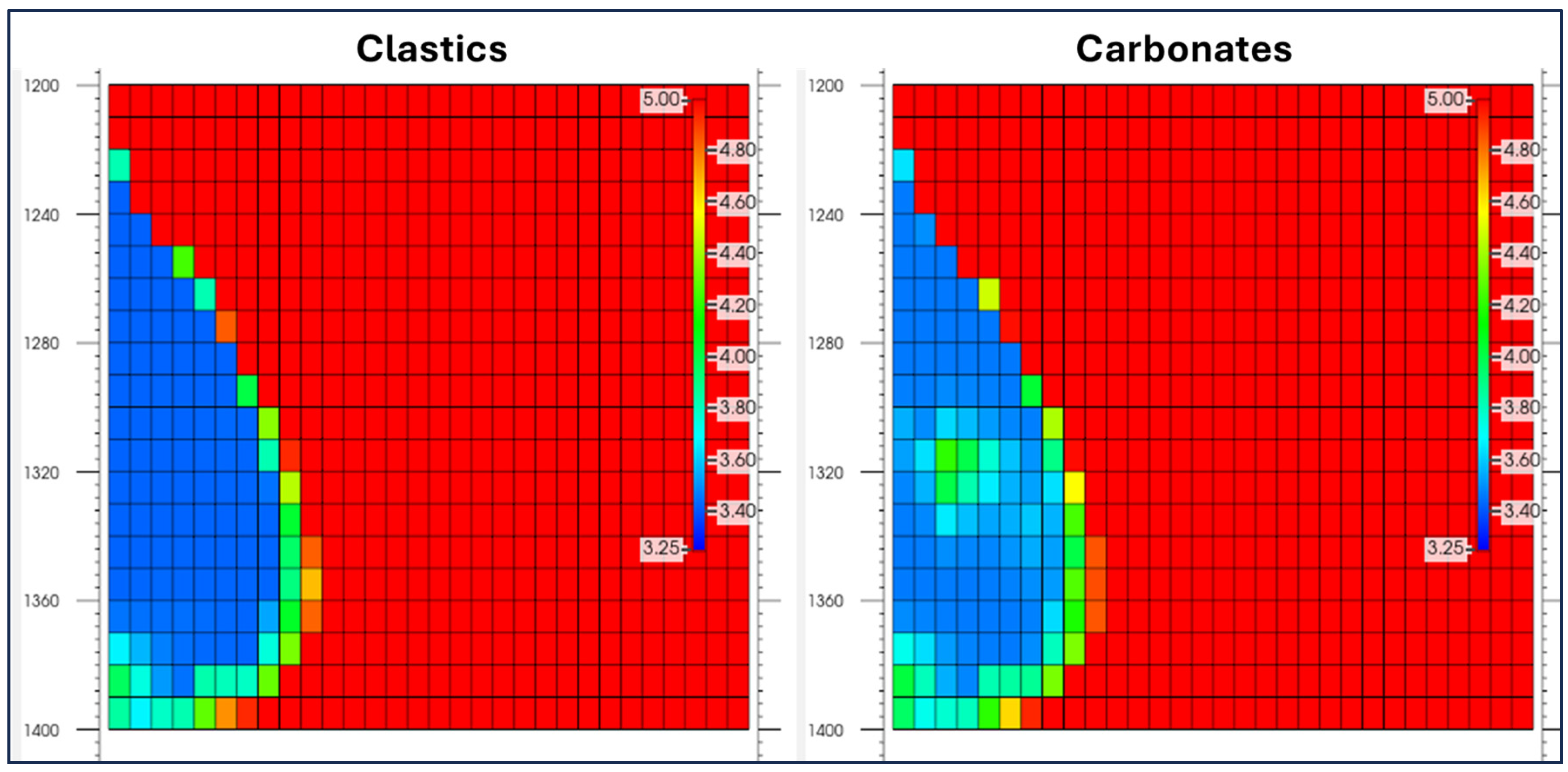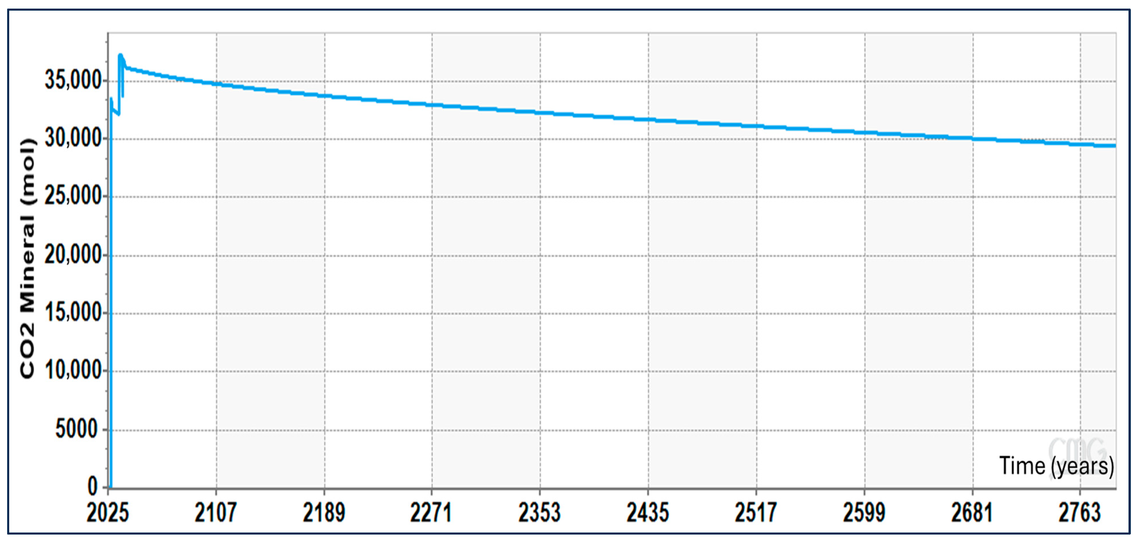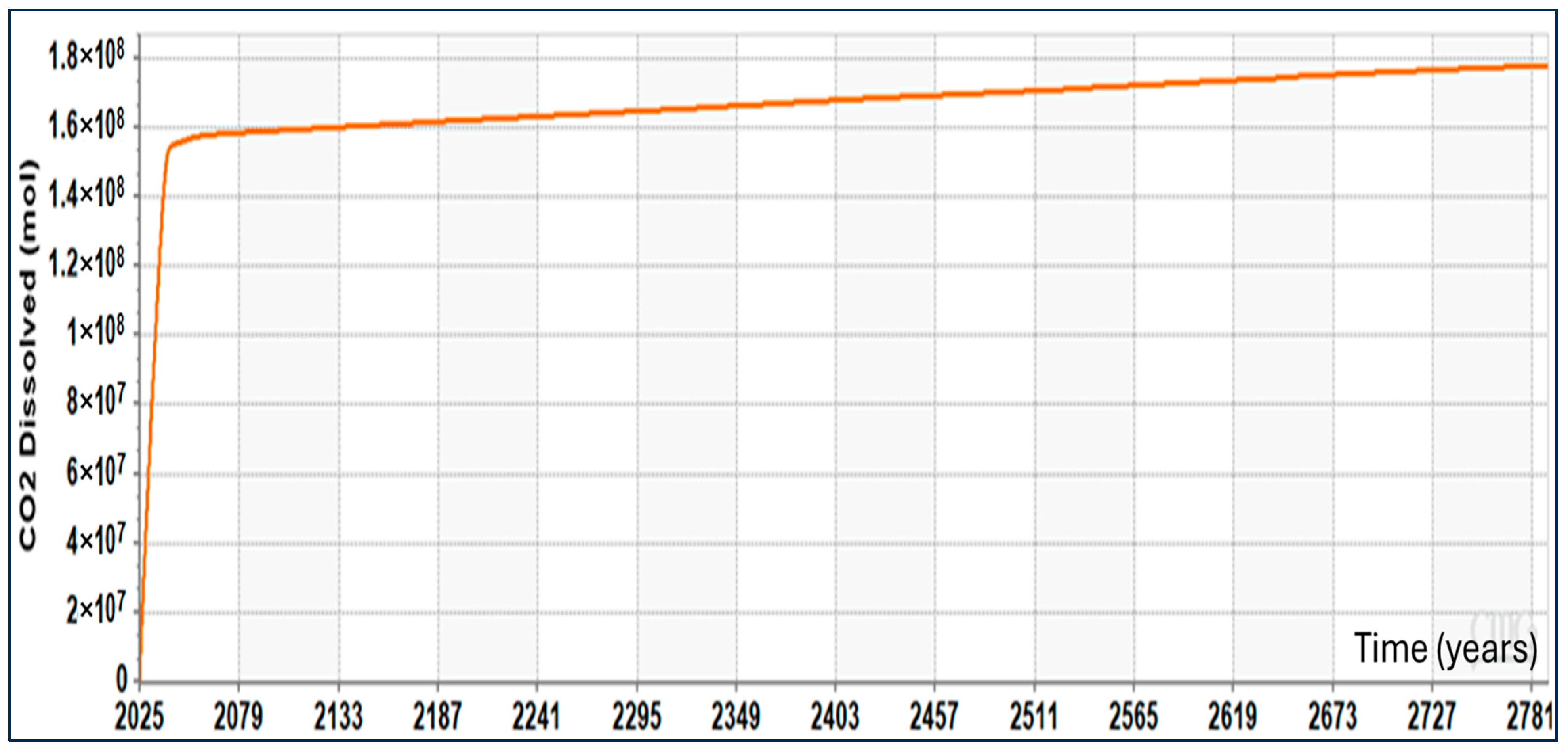 Taken together, these findings indicate that the presence of carbonate-rich formations significantly enhances solubility trapping capabilities. The higher reactivity of the mineral content would lead to a larger contact surface between the CO2 molecules and the brine. Additionally, the dissolution rates would be higher. These characteristics would allow the dissolved CO2 to extend beyond the immediate well location. Indeed, the dissolution of the CO2 into the brine makes it denser. At the same time, there would be no risk of buoyancy-related leakage. This would be accompanied by the conversion of CO2 into solid carbonate minerals.