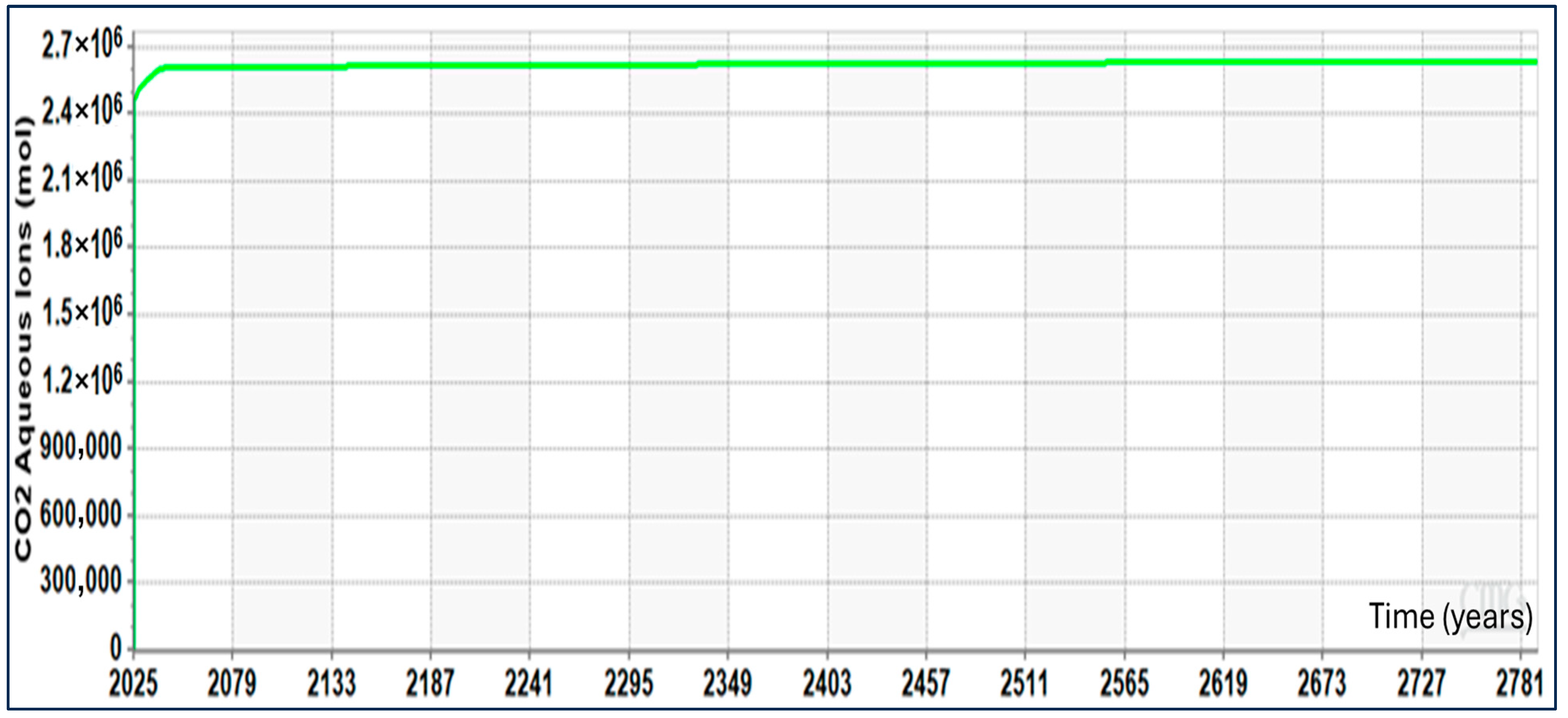 2 dissolved is at its highest level and continues to rise steadily with each annual simulation step. This is because a large amount of the injected CO