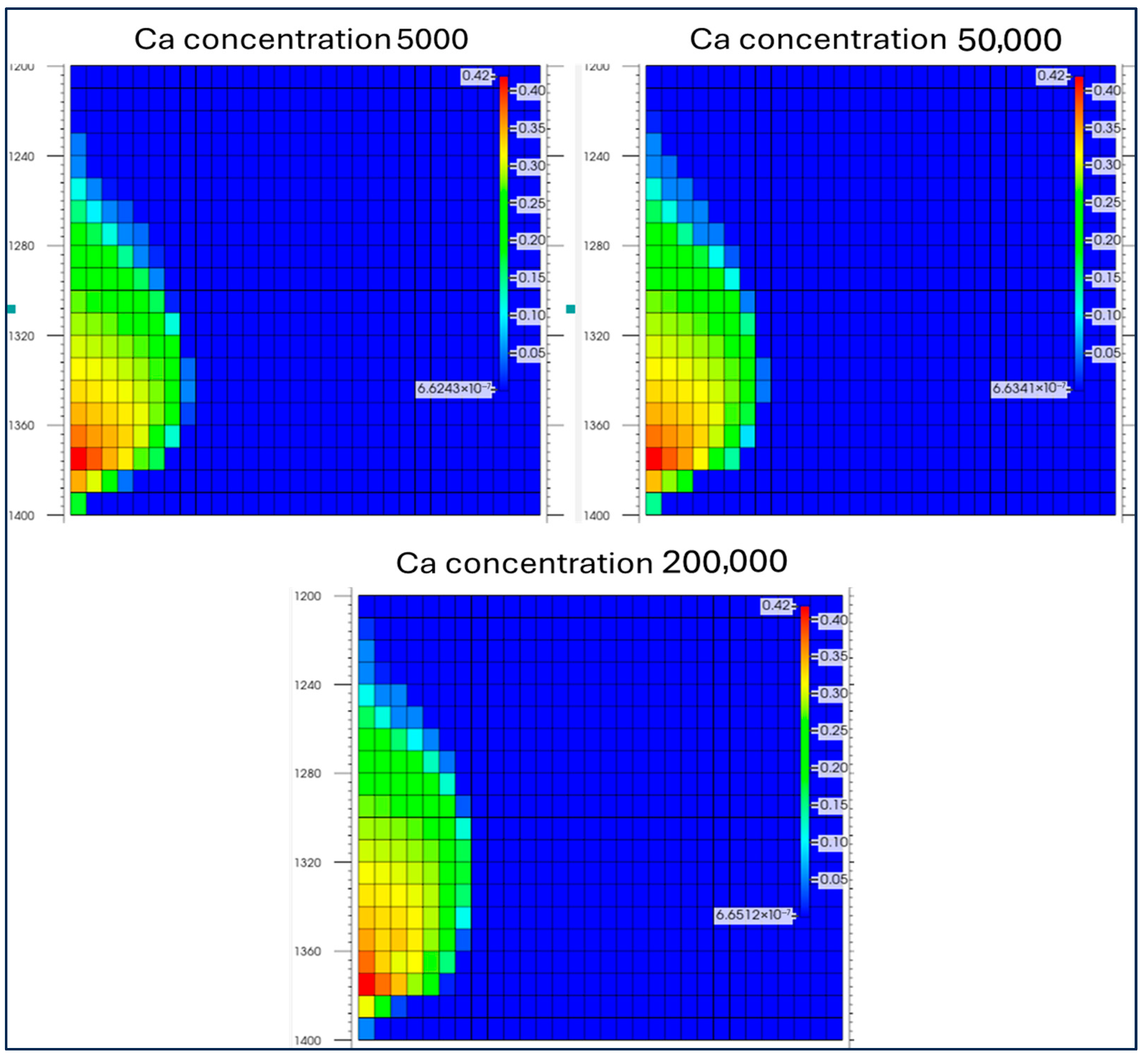 When carbonate availability increases to Ca = 50,000, the spatial coverage of trapped CO2 increases and the saturation gradients become more smoothly distributed. This is attributed to enhanced dissolution and fluid rearrangement along the plume boundary. As CO2 dissolves and weakens buoyant drive, plume migration slows and lateral expansion increases, creating broader regions of capillary snap-off and disconnection from the mobile phase. Thus, the enhanced geochemical reactivity indirectly amplifies residual trapping by encouraging more uniform plume thinning and more sustained contact with brine-filled pore structures.