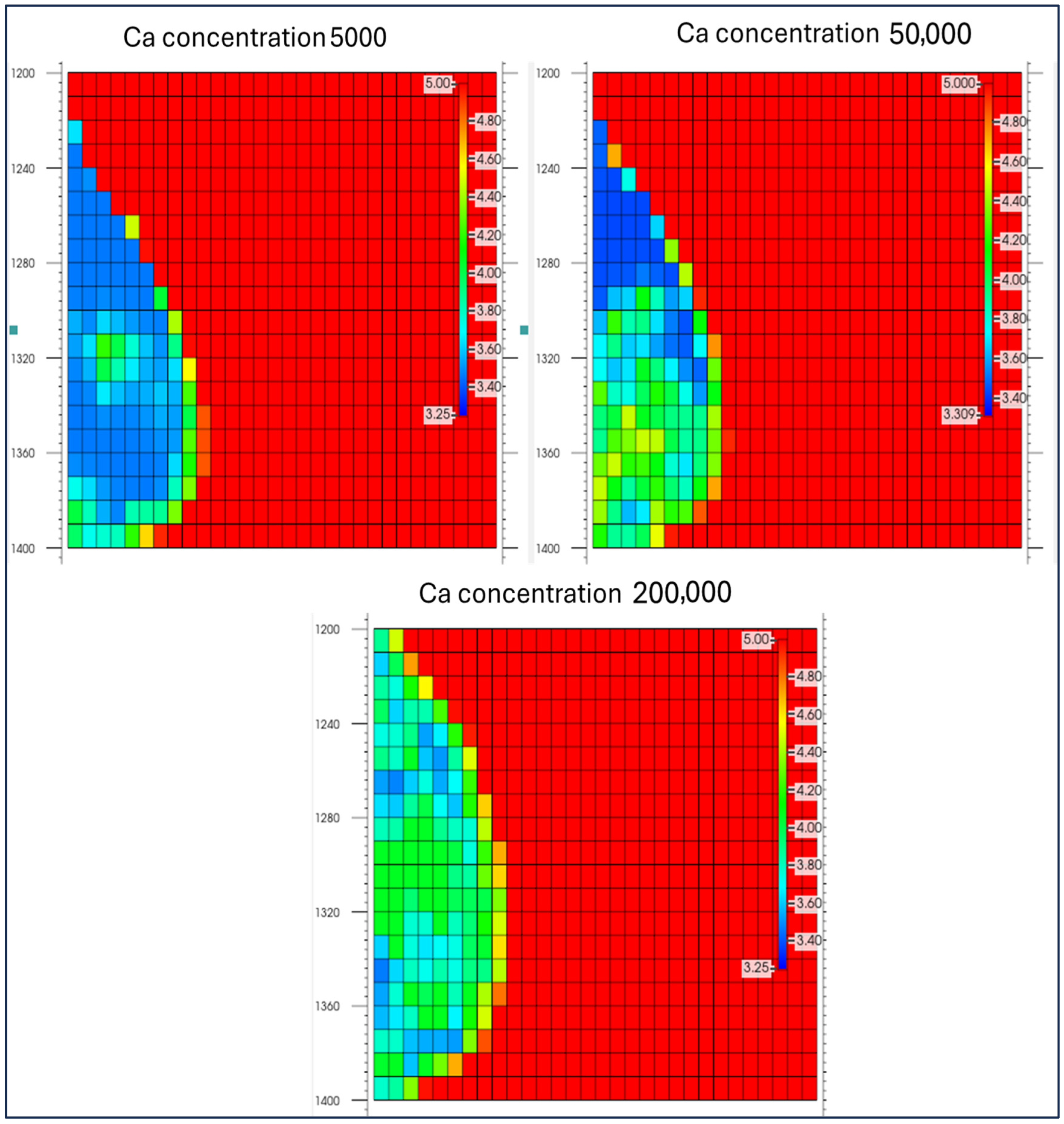 With the higher carbonate concentrations reflected by the corresponding Ca = 50,000 values, the low-pH region extends both horizontally and in-depth. An enlargement of the region suggests more aggressive interactions between CO2, the brine phase, and the rock mass. More calcite interfaces translate to favored dissolution reactions for the carbonate rock. Such chemical reactions result in a higher consumption of the formed carbonic acid. Hence, the corresponding regions representing the acidification process appear more distributed.