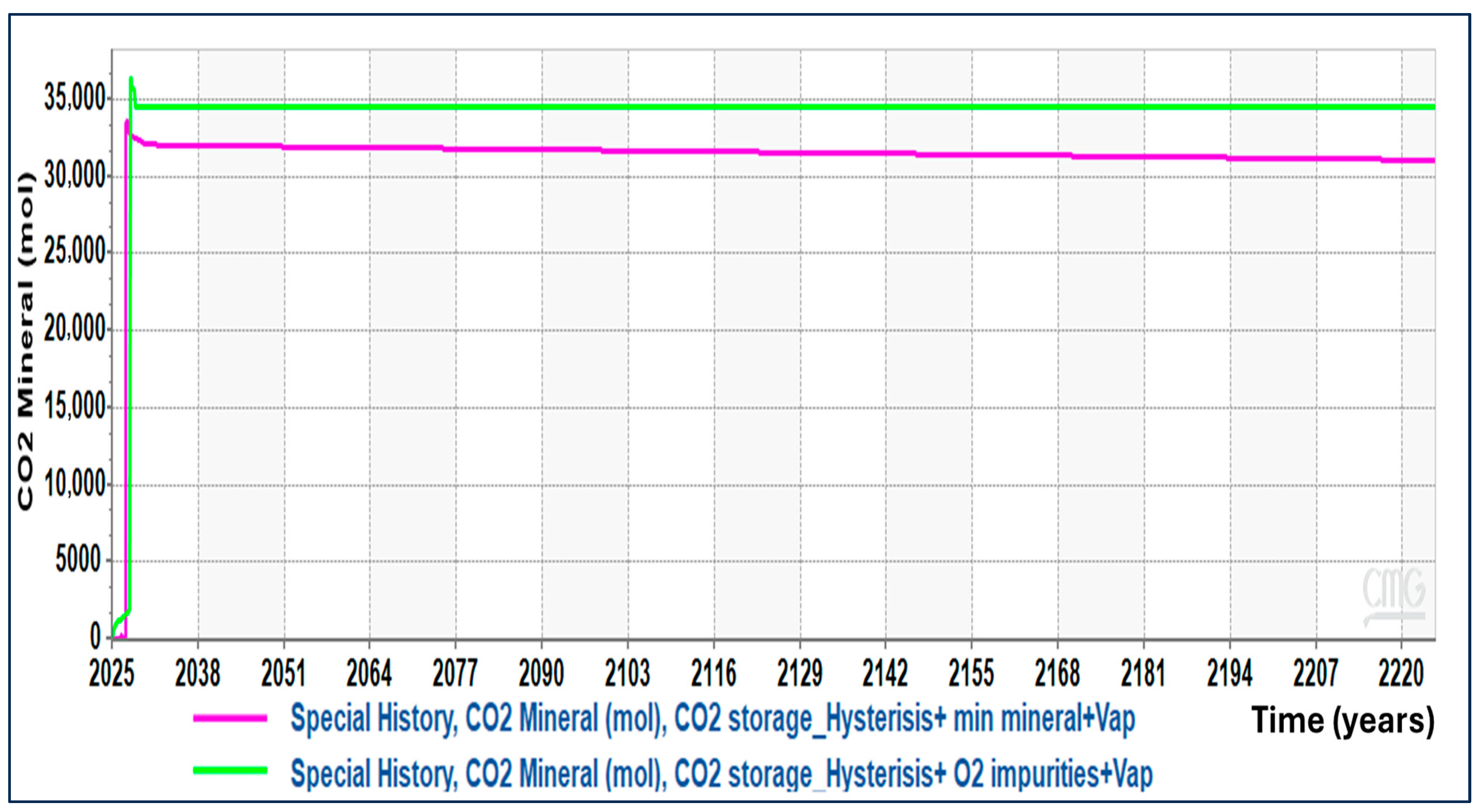Figure 19 indicates that the presence of oxygen results in a slightly higher mineral trap capacity over the entire 200-year simulation period. In the scenario without impurities, the mineralized CO