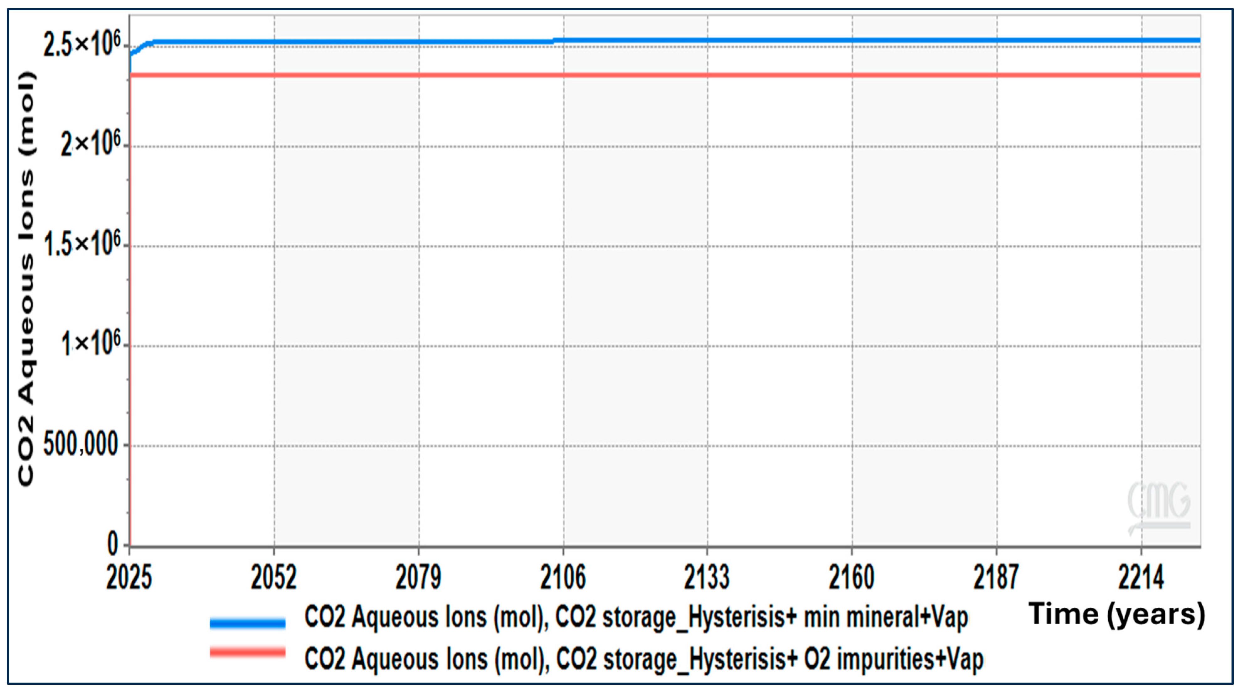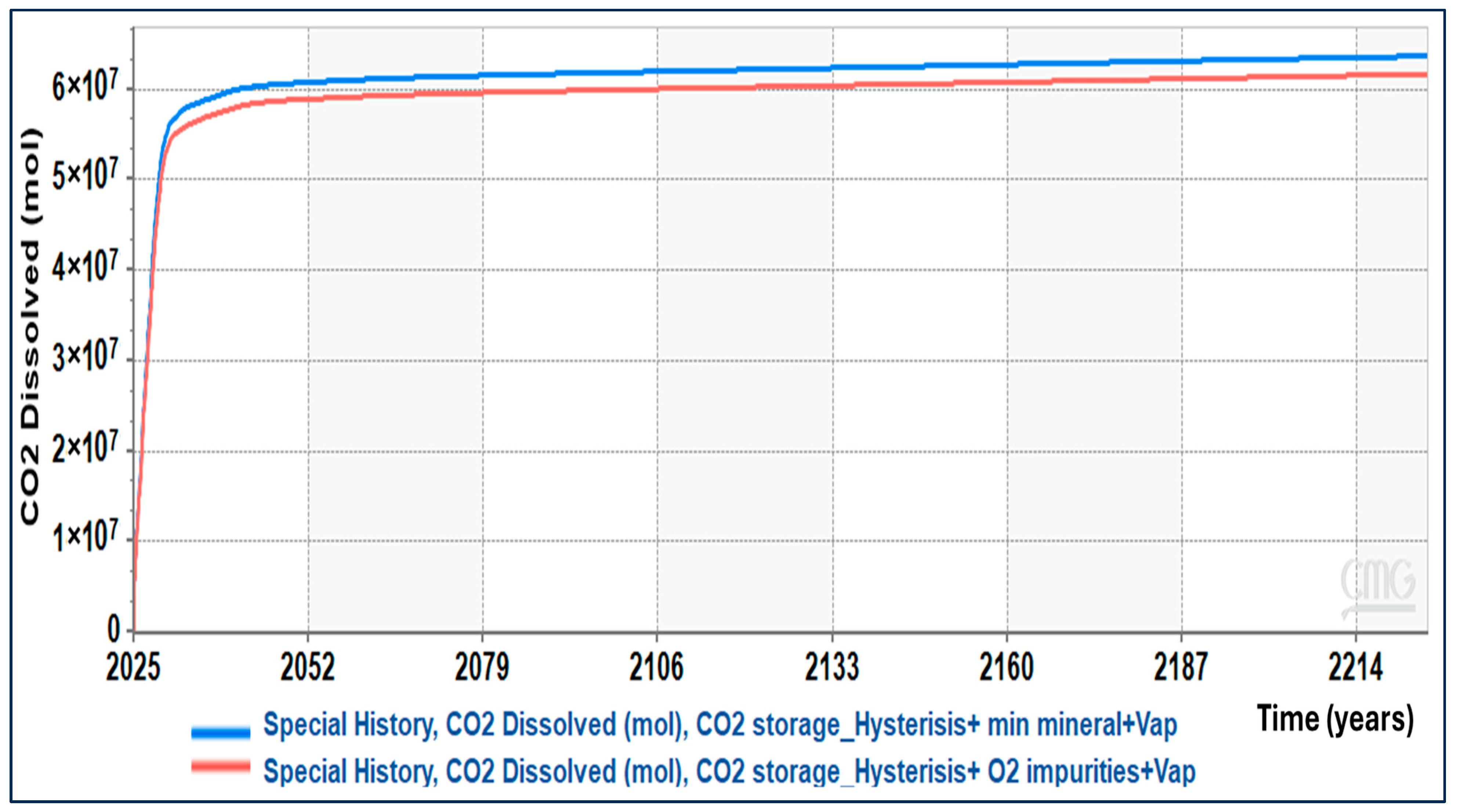 Given the importance of the mineral composition of the reservoir rock and the aquifer to the efficiency of dissolution, ion exchange, and mineral trapping, a sensitivity test has also been conducted to assess the role of rock types towards CO2 long-term containment. In consideration of further geochemical reactions triggered by oxygen impurities within the injected CO2 stream, which has the ability to expedite mineral dissolution and further influence brine chemistry and carbonate precipitation, research has also assessed the role of oxygen impurities.