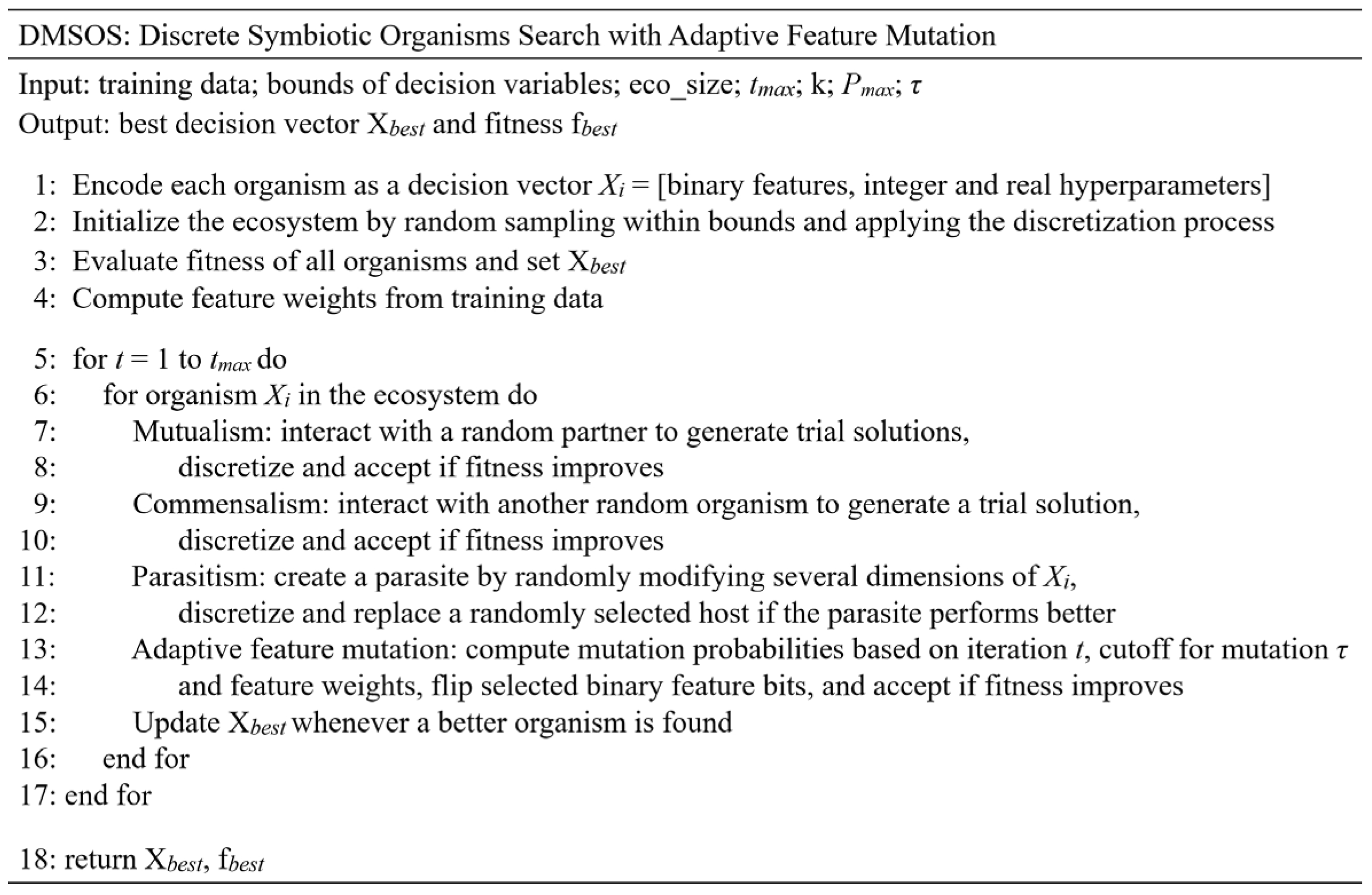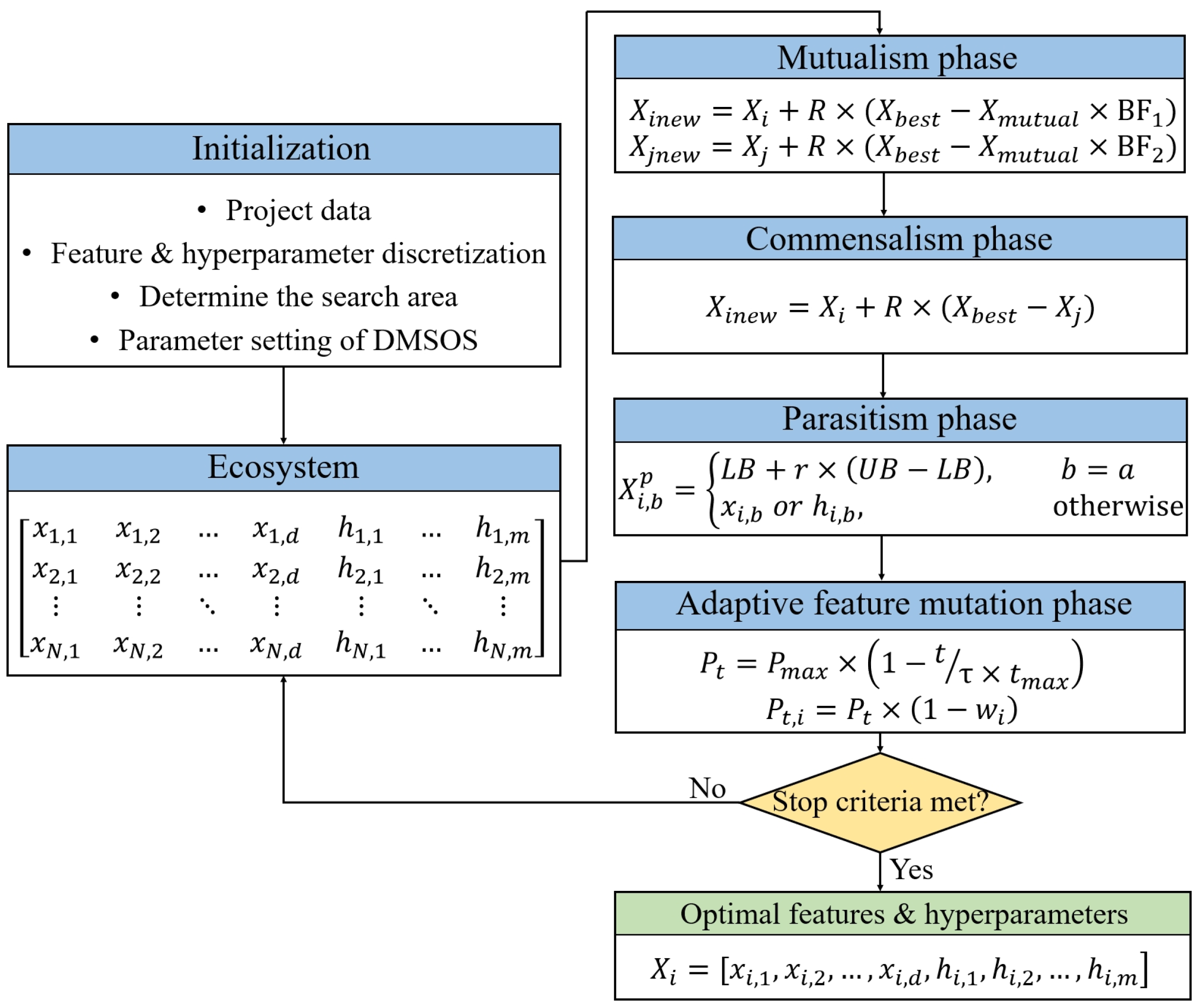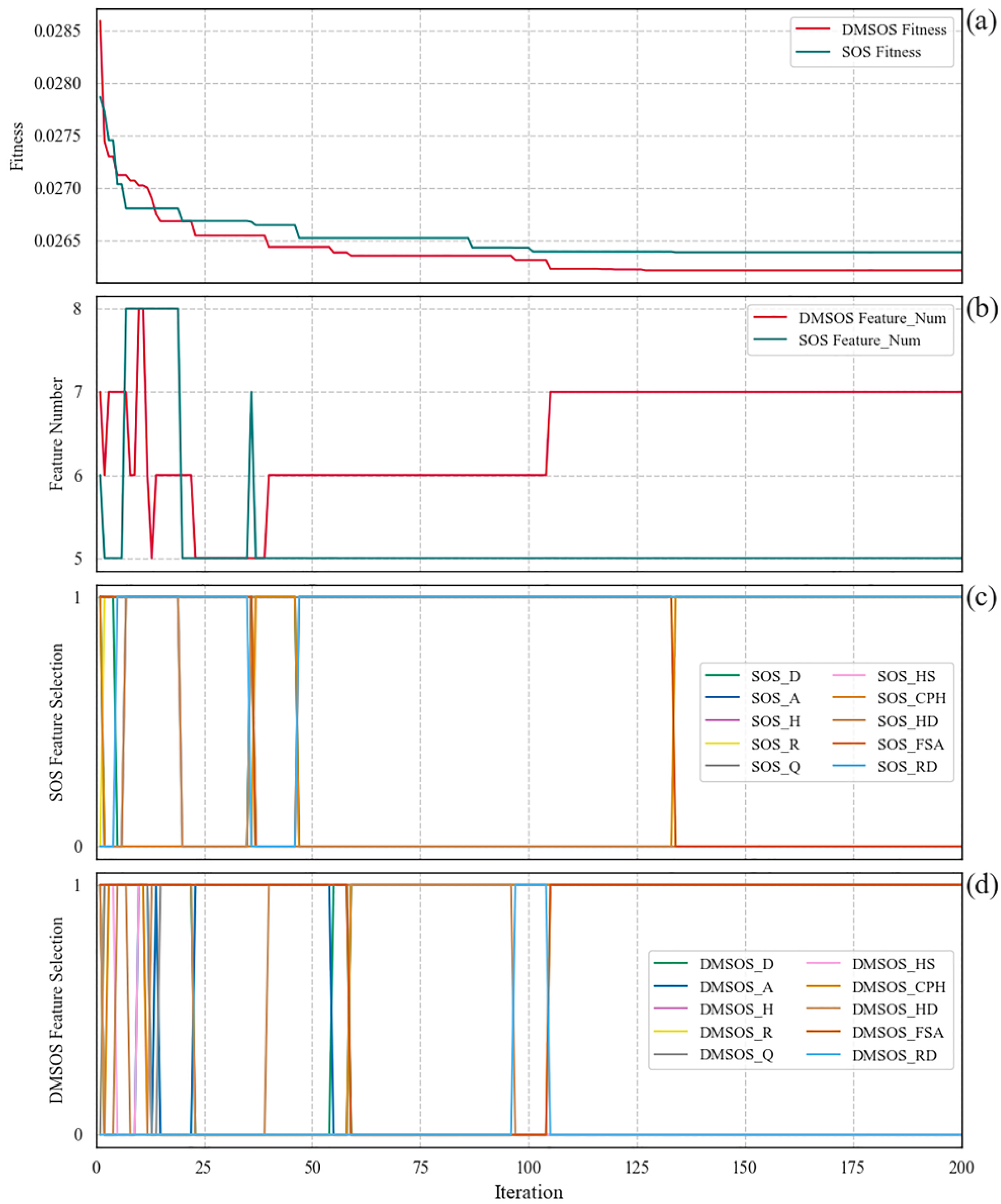 The sensitivity of parameter settings requires further investigation. Both the preliminary feature selection and the DMSOS algorithm involve several parameter settings, such as the correlation threshold for the filtering process, the adaptive mutation probability strategy, and the bounds of the hyperparameter search space. In this study, these settings were mainly determined through preliminary trials or empirical selection, without a comprehensive parameter sensitivity analysis. Therefore, the impact of different parameter configurations on the feature and hyperparameter optimization results has not been quantified. Future research will involve a comprehensive sensitivity analysis and explore adaptive control strategies for DMSOS, thereby reducing the dependence on manual parameter tuning.