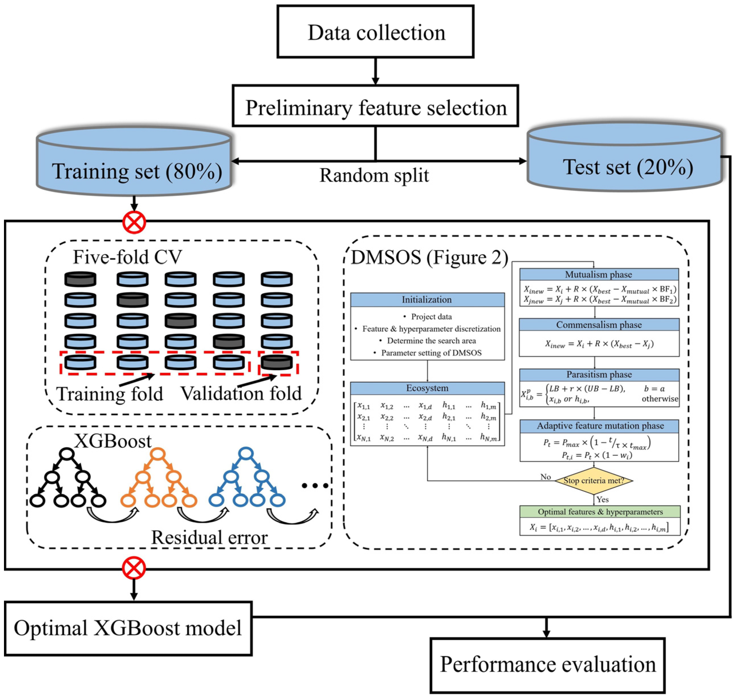 Therefore, this study proposes a systematic framework that integrates feature selection and hyperparameter optimization. First, a preliminary feature selection method is developed to eliminate redundant variables based on prior knowledge and statistical analysis. Second, a novel discrete symbiotic organisms search algorithm with adaptive feature mutation (DMSOS) is introduced. This algorithm simultaneously optimizes features and hyperparameters for the XGBoost model, enhanced by a mutation strategy based on time and weight to balance exploration and exploitation during optimization. Finally, the proposed DMSOS-XGBoost model is validated based on the blasting vibration data of a shaft project and compared with other sequential modeling strategies, and the feature importance analysis of the model provides guidance for field construction.