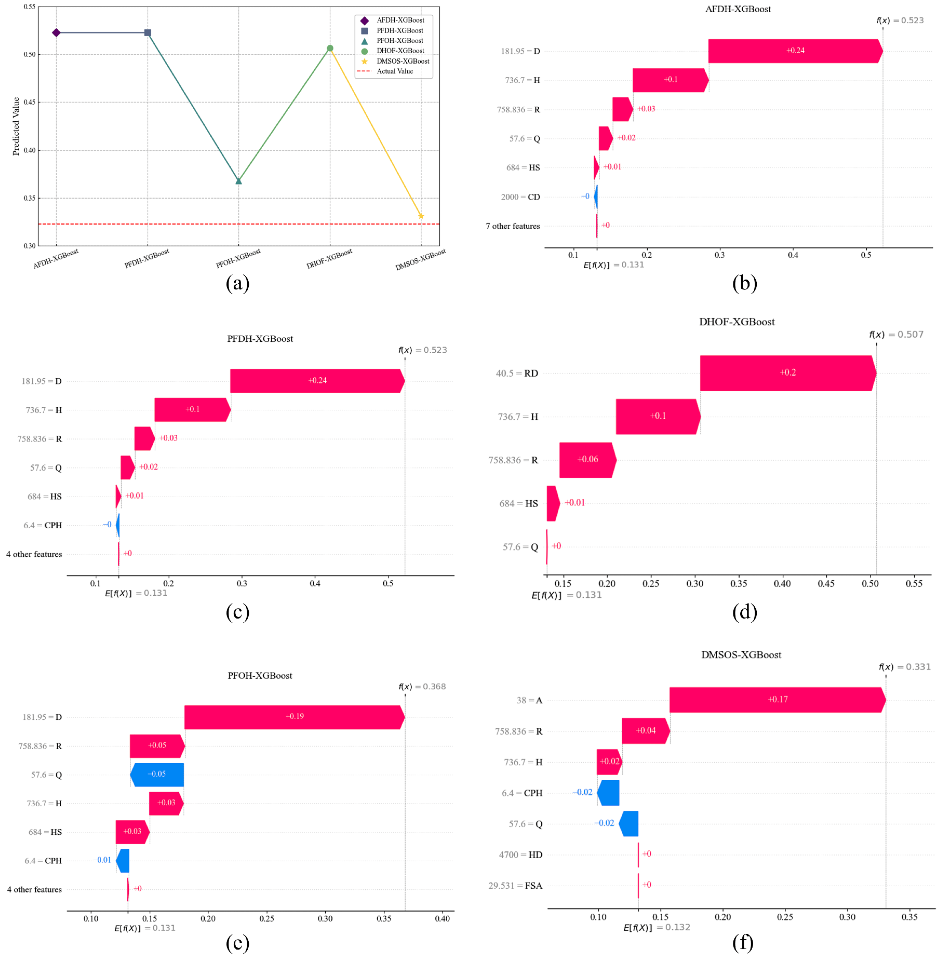 Figure 16b–f, the contributions of features in the local explanation waterfall plots for the AFDH-XGBoost and PFDH-XGBoost models were consistent, leading to the same prediction value. In this particular prediction sample, spatial geometry features D, H, and R, along with the explosive charge feature Q, made significant positive contributions, resulting in a prediction value higher than the actual value. Similarly, in the DHOF-XGBoost model, contributions from all features were also positive, which resulted in significant prediction errors. In the PFOH-XGBoost and DMSOS-XGBoost models, features Q and CPH from the explosive charge feature group had negative contributions to the prediction results, which offset part of the positive contributions from the spatial geometry feature group, thus bringing the prediction closer to the actual value.