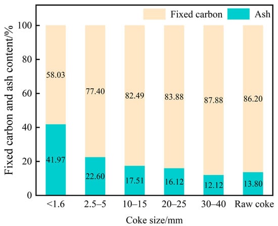 In the melter gasifier, the moisture and volatile matter in coke were almost eliminated when coke reached tuyere level. Proximate analysis of tuyere-extracted coke therefore focused on ash and fixed-carbon contents (Figure 2). Figure 2 illustrates that as the mean particle size of the coke sample decreased, its fixed carbon content also reduced. This is mainly attributed to the gradual consumption of fixed carbon during the coke degradation process. Consequently, the ash fraction increased.