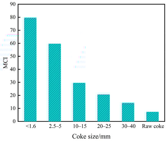 The MCI values for each coke sample are presented in Figure 3. It shows that the MCI values of tuyere-extracted coke samples distinctly increased compared to the raw coke and reached the maximum at <1.6 mm coke size. This is attributed to the accumulation of alkali metals within the melter gasifier. As solution loss proceeded, fixed carbon of coke was consumed and its ash content increased while the coke particles shrank. Moreover, the composition of the coke ash also varied as coke particle size decreased at the tuyere level (Table 2). These combined factors ultimately caused the MCI to rise as the coke particle size decreased.