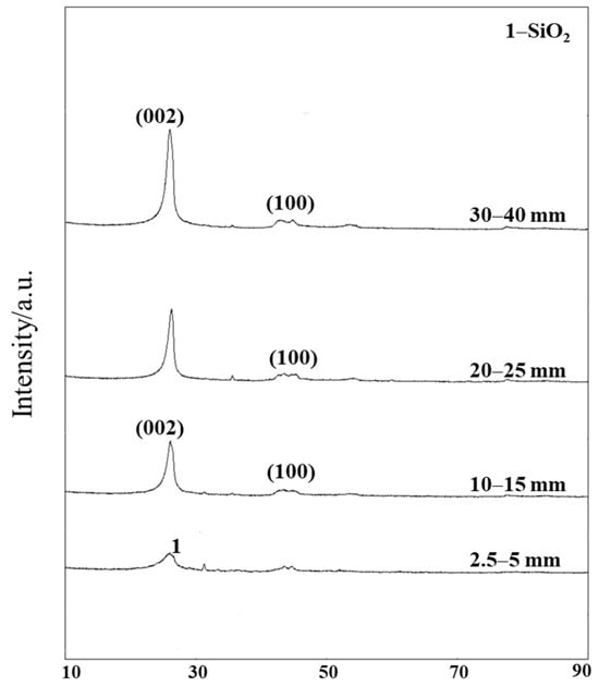 To examine the microcrystalline structure of tuyere-extracted coke with different sizes, X-ray diffraction (XRD) analyses were first conducted (Figure 4). Based on their XRD patterns, the microcrystalline structure parameters of coke samples were further analyzed (Table 3).
