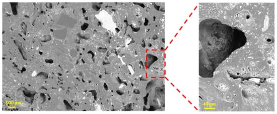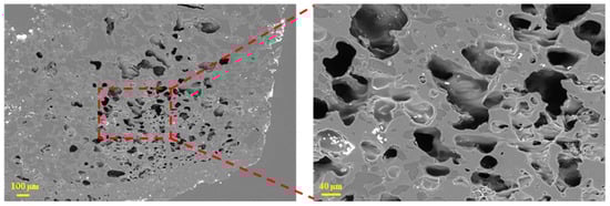Figure 7 shows that the coke sample with a size of 10–15 mm also had a high porosity, but the pores were distributed relatively uniformly. Compared with the smaller coke (2.5–5 mm), the pores in this size class were generally larger, and some pores were filled with white solids (coke ash or molten slag).
