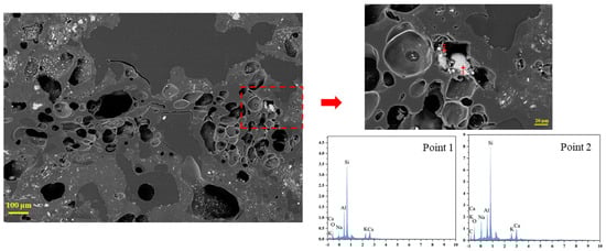 Figure 8 shows that the coke with a size of 20–25 mm had a relatively sparse pore distribution. White substances also appeared in some pores, as in the coke with size of 10–15 mm. The bigger coke sample (30–40 mm) contained pronounced pore clusters with numerous interconnected voids (Figure 9). Few big pores were present, and some white particles were retained inside the pores. To further analyze these white substances, the coke sample with a size of 30–40 mm as a representative was characterized by energy-dispersive spectroscopy (EDS). Figure 9 also reveals that spherical, granular, and amorphous coke ash (or slag) existed within the pores. EDS analysis indicates that these white substances were rich in CaO, SiO2, Al2O3, and alkali metals. Their presence accelerated the solution loss reaction and intensified coke degradation.