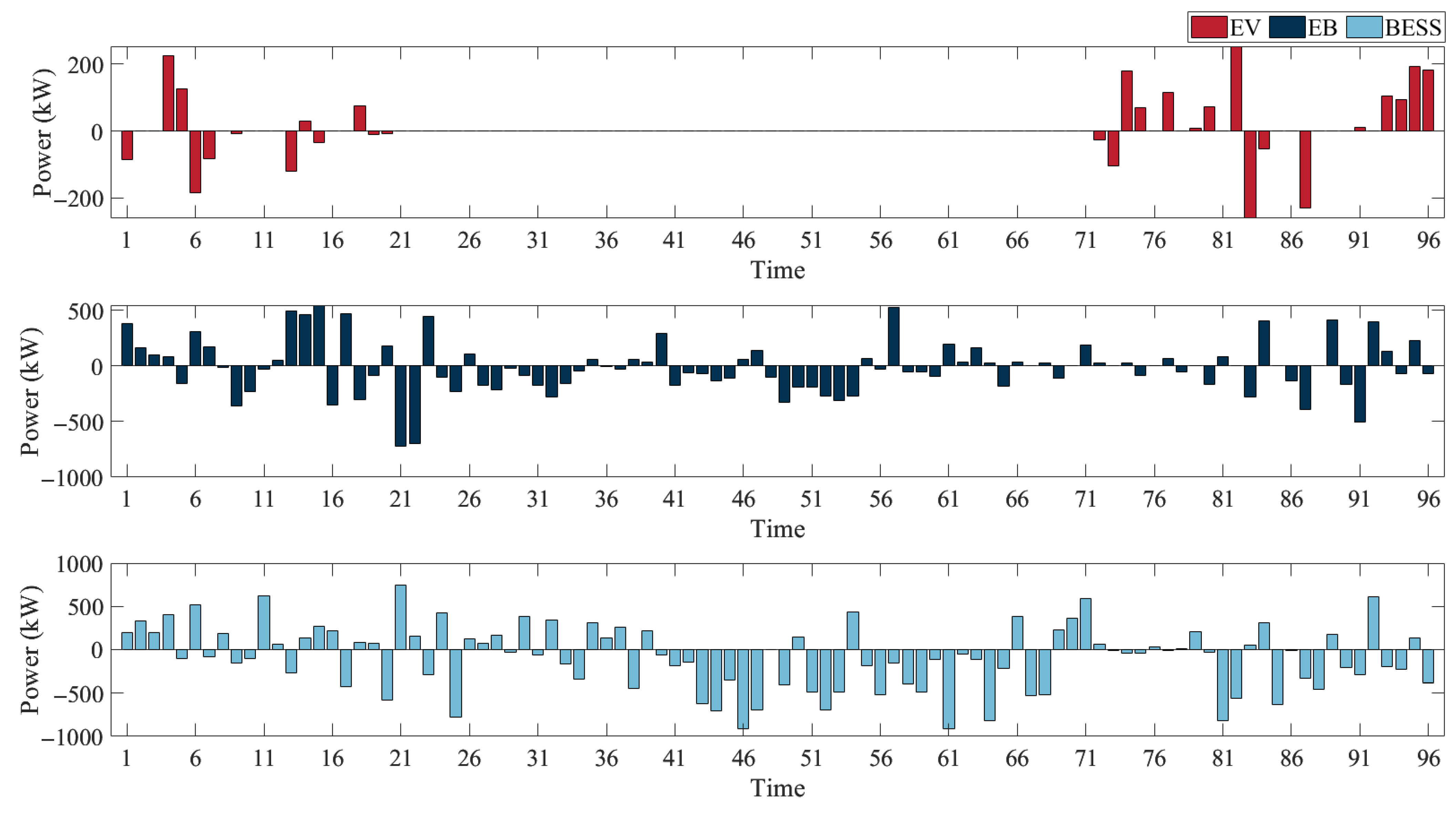 - The presented multi-objective optimization model explicitly incorporates EBs as co-optimizable entities alongside EVs and BESS, effectively coordinating them to minimize load fluctuation and total electricity cost.