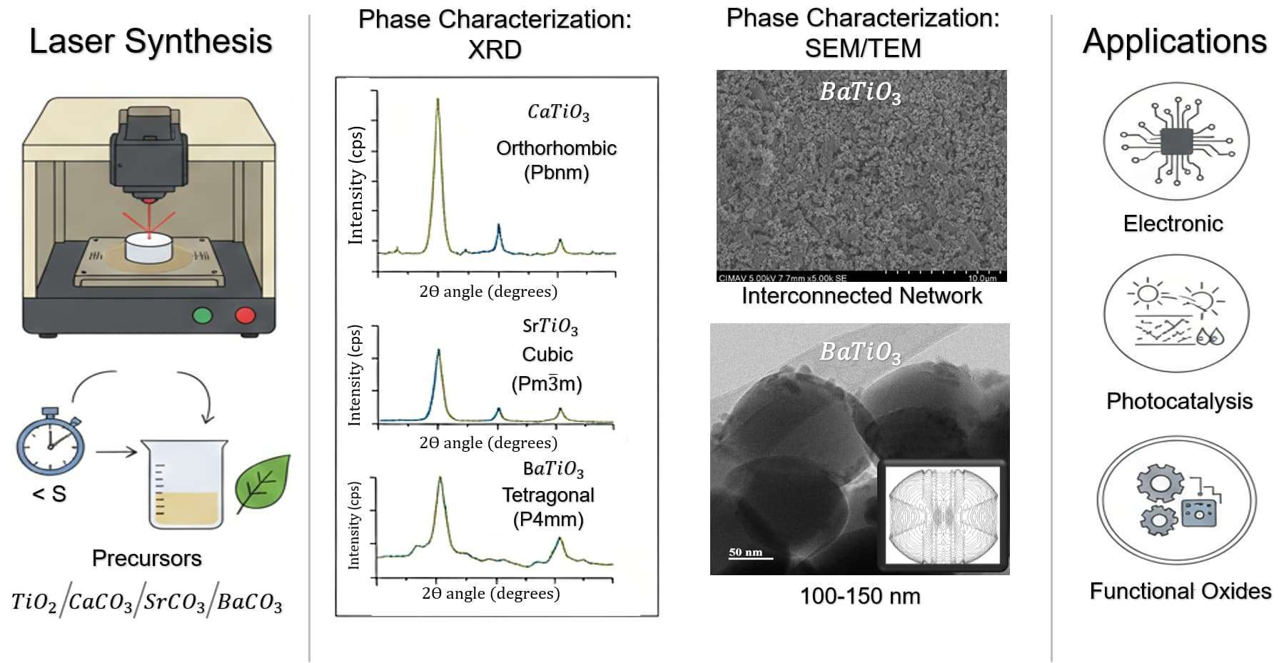 | Laser engraver | - Rapid and efficient - No calcination required - Nanoparticle production - Low energy consumption - Eco-friendly | - Limited to shallow processing depths (~2 mm) - Some perovskites have an amorphous fraction. | This work |