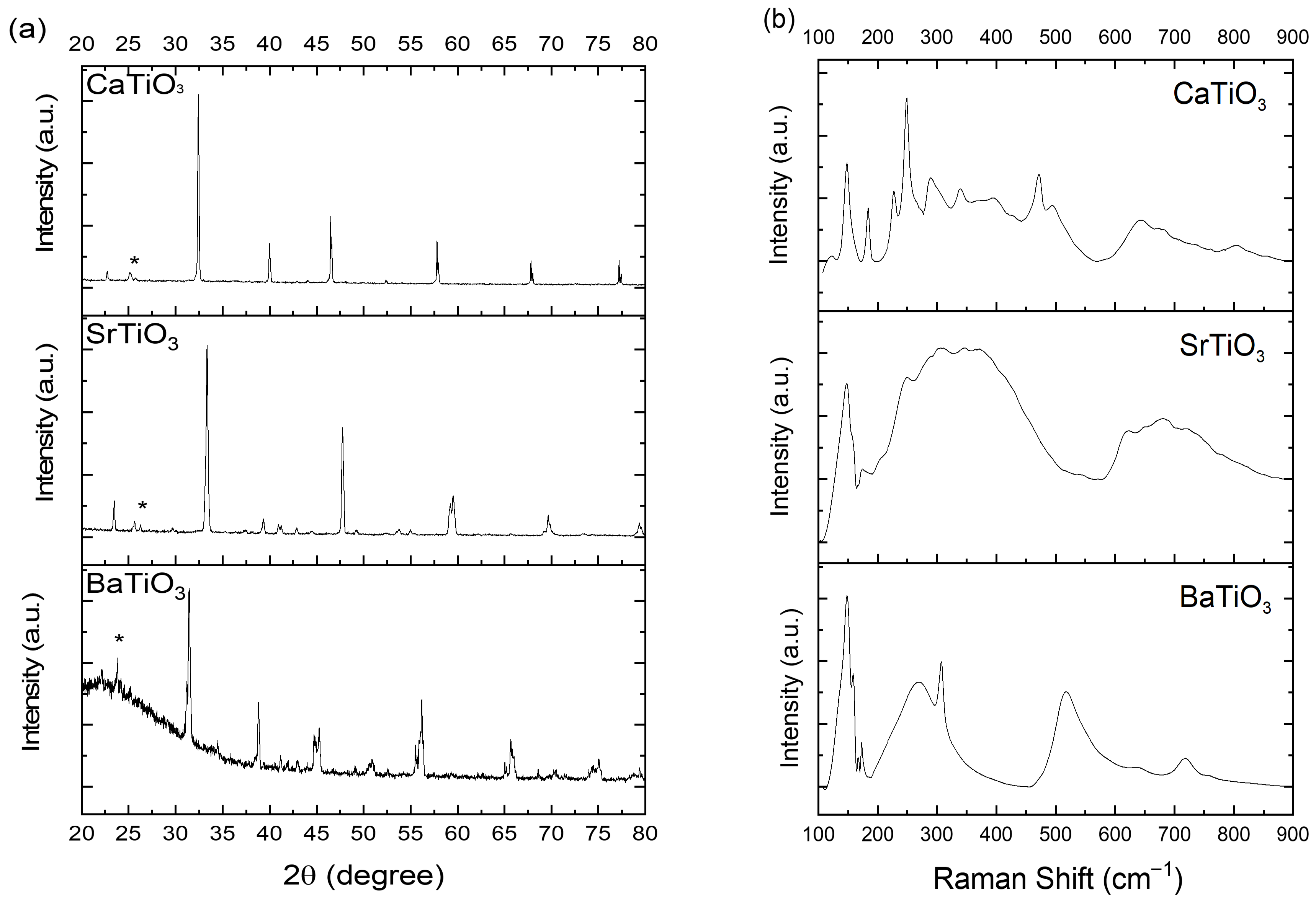 - Zheng, H.; Reaney, I.; de Györgyfalva, G.C.; Ubic, R.; Yarwood, J.; Seabra, M.; Ferreira, V. Raman spectroscopy of CaTiO3-based perovskite solid solutions. J. Mater. Res. 2004, 19, 488–495. [Google Scholar] [CrossRef]