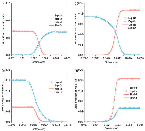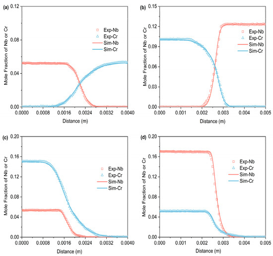 In the formula, and denote the weighting factors for minimizing concentration and diffusion flux errors, respectively. Both were initially set to 0.5. represents the number of experimental data points measured by EPMA. and denote the experimental and calculated compositions of element at the -th experimental point, respectively, and and represent the experimental and calculated interdiffusion fluxes of element at the -th experimental point. The expression for is as follows: