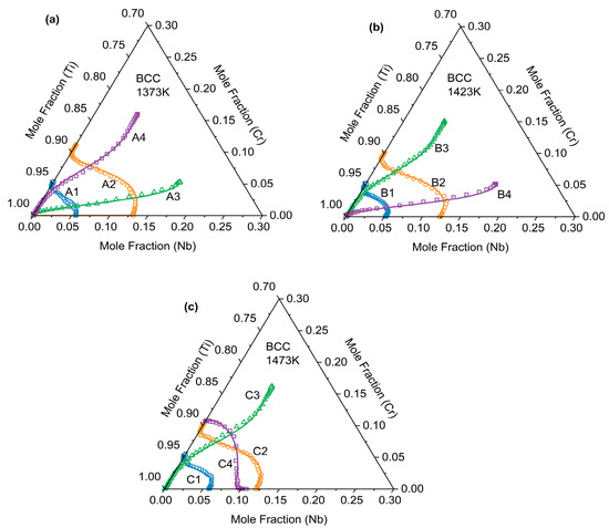 This paper presents the diffusion paths of the Ti-Cr-Nb ternary diffusion couples after annealing at three temperatures: 1373 K, 1423 K, and 1473 K, as shown in Figure 6. The experimentally measured composition data were further projected onto the corresponding isothermal sections of the Ti–Cr–Nb ternary phase diagram. All diffusion paths remain entirely within the single-phase β (BCC_A2) region and exhibit smooth, continuous trajectories without crossing phase boundaries. This consistency confirms the reliability of the measured composition profiles and supports the accuracy of the inverse-fitted diffusion kinetic parameters. As shown in Figure 6, all diffusion paths exhibited a distinct “S”-shaped curvature rather than straight lines. They bent noticeably at both ends of the diffusion couple while remaining nearly straight in the middle—a typical feature of diffusion-controlled composition evolution. This behavior arose from the composition-dependent variation in the diffusion coefficients of Cr and Nb within the Ti-Cr-Nb ternary alloy. In the diffusion paths, the curve tended to bend convexly when the composition approached the Ti-Nb side, whereas it became concave when moving toward the Cr-rich corner. This indicates that in the BCC (β) phase of the Ti-Cr-Nb alloy, Cr diffuses more rapidly than Ti and Nb, and the diffusion rate is influenced by composition.