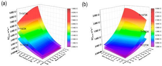 Composition-dependent main diffusion coefficient surface maps at 1372 K, 1423 K, and 1473 K: (a) ; (b) , where the composition range of Nb is 0–17.1% and the composition range of Cr is 0–16.2%.