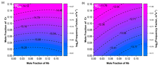Contour plots of frequency factors (a) ; (b) . The Nb content ranges from 0 to 17.1%, and the Cr content ranges from 0 to 16.2%.