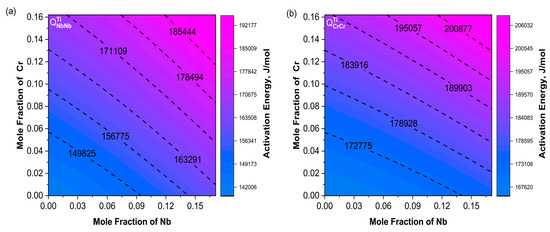 Contour maps of activation energy (a) ; (b) . The Nb content ranges from 0 to 17.1%, and the Cr content ranges from 0 to 16.2%.