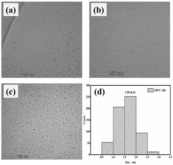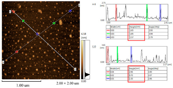 Figure 1 presents the TEM images of the coal-based CDs derived from WCW coal in condition 1. Two regions with different morphologies can be observed under the microscope: a blending zone containing some amorphous products and CDs (Figure 1a) and an aggregation zone containing plentiful CDs (Figure 1b,c). When the electron beam focused on the amorphous products, they dissipated and disappeared quickly, indicating that some active intermediates were generated from the top-down process. In contrast, the aggregation zone is more stable, and CDs are more uniformly dispersed from 0.5 to 3.0 nm, with an average diameter of 1.59 ± 0.43 nm from the statistics of 500 random particles (Figure 1d). The AFM image (Figure 2) reveals that the heights of the as-made CDs are between 0.7 and 3.0 nm, consistent with the TEM results. According to the report from Wang et al. [38], a single CD particle contains clear lattice stripes, where the lattice spacing is around 0.21 nm, corresponding to the (100) crystal plane diffraction of graphite. Based on this, it can be concluded that coal-based CDs exist as clusters composed of multilayer graphite carbon.