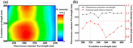 To investigate the effect of excitation wavelength on the PL properties of CDs, the prepared CD solution was characterized (Figure 5). The excitation wavelength range was set from 300 to 400 nm, and the emission peak range was from 420 to 650 nm. For these CDs, as the excitation wavelength increased from 300 nm to 400 nm, the peak position of the fluorescence emission consistently fluctuated around 508 nm. Within 300–400 nm, it exhibited characteristics independent of the excitation wavelength, indicating that the CD size is relatively uniform and the excited-state molecular structure is stable. The emission peak intensity of the CDs reached its maximum at an excitation wavelength of 320 nm, confirming 320 nm as the optimal excitation wavelength for the CDs. Therefore, 320 nm was selected as the optimal excitation wavelength for measuring the optical properties of CDs.