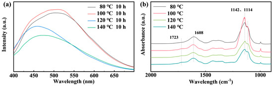 Figure 6 presents fluorescence spectra of coal-based CDs derived from different reaction temperatures and times. It is observed that the PL intensity of CDs increases first and then decreases with the reaction temperature. As for the spectra of FT-IR, most functional groups of the structure change a little with the increase in reaction temperature except the C–O bond. While high temperature facilitates oxidation, promoting C–O formation, it also results in the release or decomposition of nitric acid, reducing the effective reaction time between acids and coal. The C–O signal reaches its highest value for CDs at 100 °C along with PL intensity. Previous research demonstrated that polar functional groups can be the main fluorescence auxiliary, enhancing the fluorescence greatly [41]. The consistency between the evolution of C–O-related signals and PL intensity indicates that C–O groups may contribute to the PL behavior of the coal-based CDs.