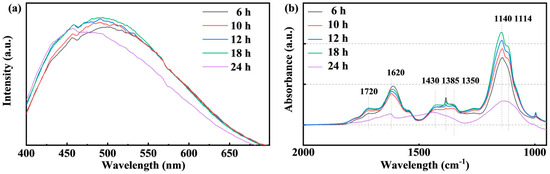 The fluorescence spectra (a) and FTIR spectrum (b) of coal-based CDs obtained in different reaction times.