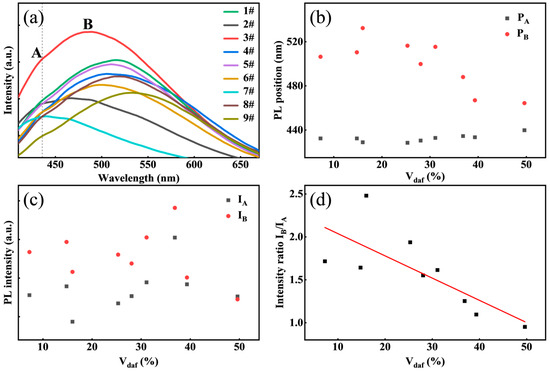 (a) The fluorescence spectra of coal-based CDs derived from different coal ranks (Peak A corresponds to a weak emission peak at approximately 430 nm, while Peak B represents a variable-position emission peak in the range of 465–530 nm.); (b–d) the effect of Vdaf on the optical properties of coal-based CDs.
