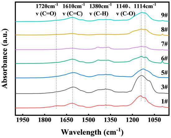 Figure 10 gives FTIR spectra of coal-based CDs from different coals. We can observe that the content of the C–O bond of CDs derived from 7# is weakest and that of 3# is strongest, corresponding to the lowest and highest PL intensity, respectively. This is just consistent with what we found above, that C–O greatly affects the PL behavior of CDs. However, for CDs derived from other coals, no significant correlation between C–O and PL behavior can be found. When it comes to C–H and C=O, there is no prominent correlation between these functional groups and PL behavior either. Without a doubt, PL behavior can be influenced by other structural factors, such as the carbon framework structure.